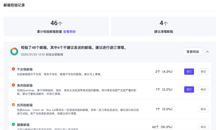 4. 验证完成后,系统将提供详细结果,便于你清理名单或进行分群管理