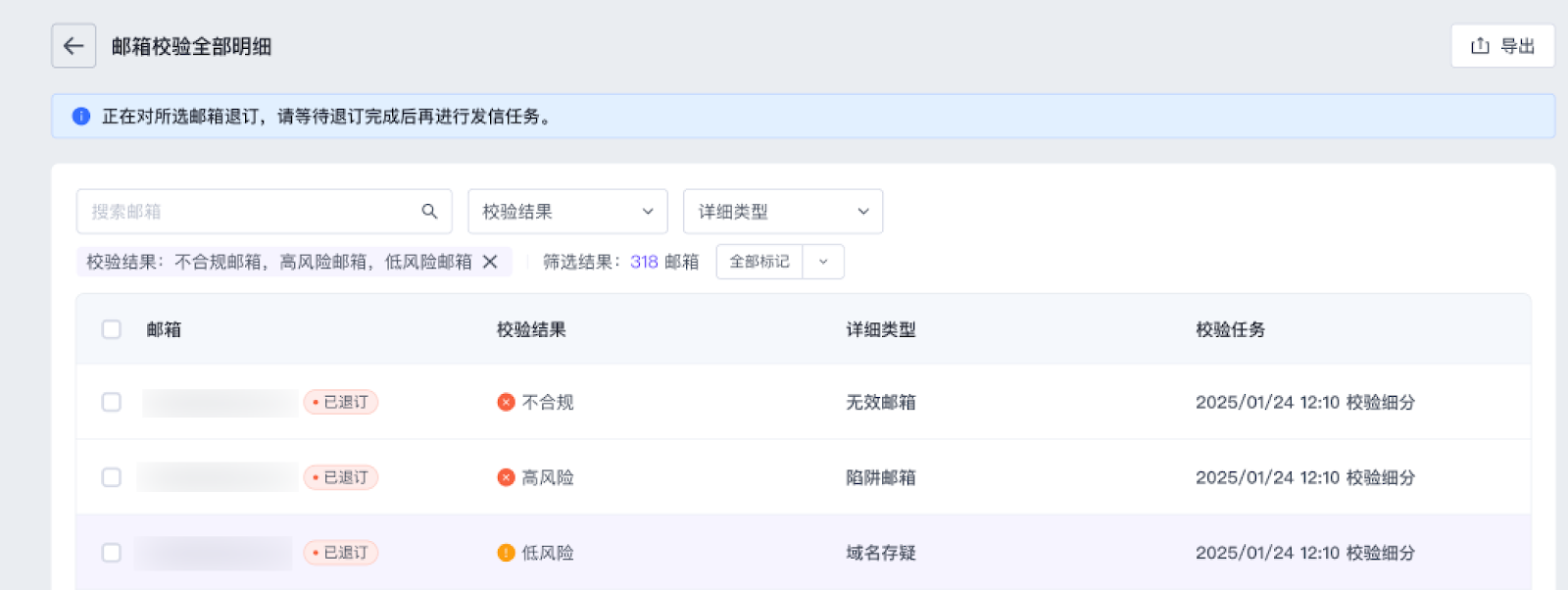 - 校验结果将包含四类:不合规邮箱、高风险邮箱、低风险邮箱、健康邮箱