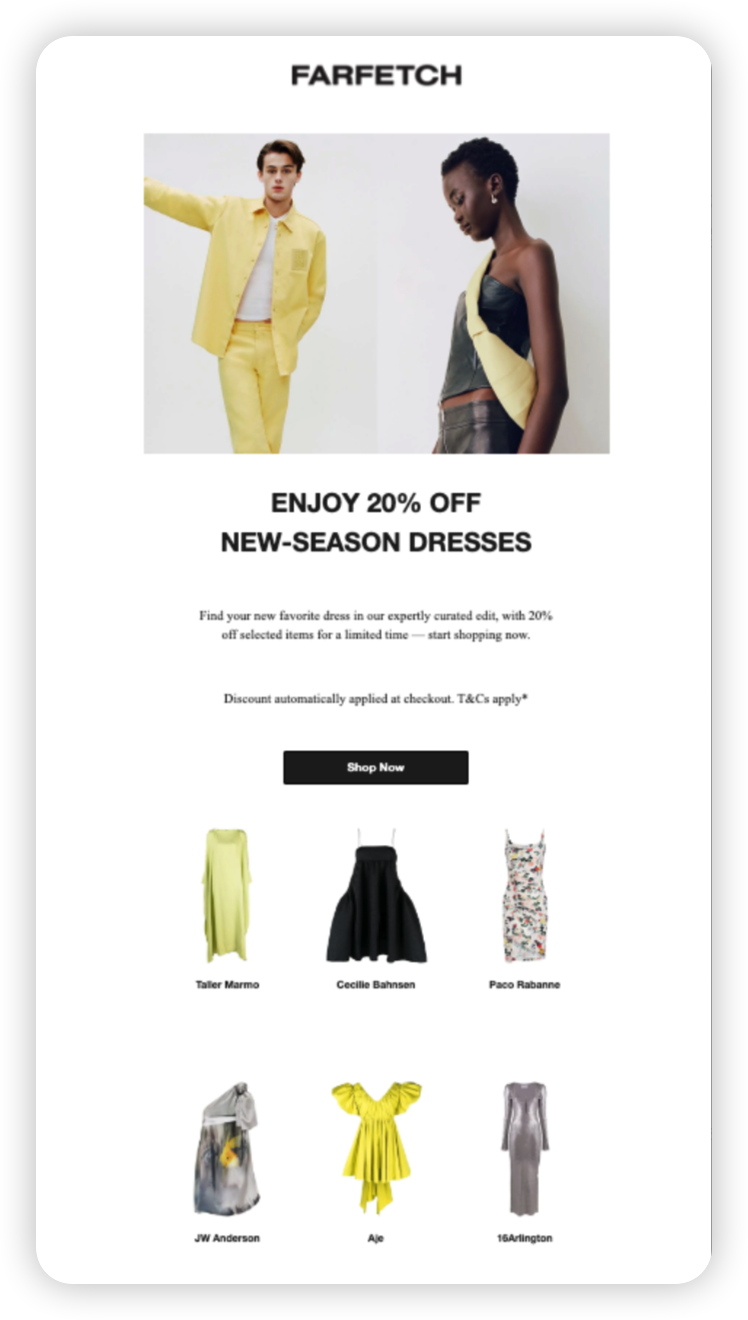新品结合早鸟Sale也是一种可以促进新品销售,增加点击的办法。这种促销方式更适合邮件渠道,因为投放和展示的人群是有限的,作为提高点击的噱头也不会导致折扣占比太大而压缩新品的利润空间。farfetch就是通过这种方式来推广新季裙装,折扣+商品标题+商品图片的罗列(同样高价商品不展示价格) ;farfetch的邮件在视觉上追求极简,这与其奢品的品牌调性也是契合的。