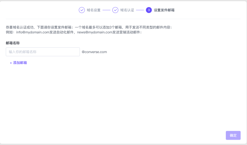 Step3:设置发件邮箱:一个认证完成的域名最多支持配置3个发件邮箱;
