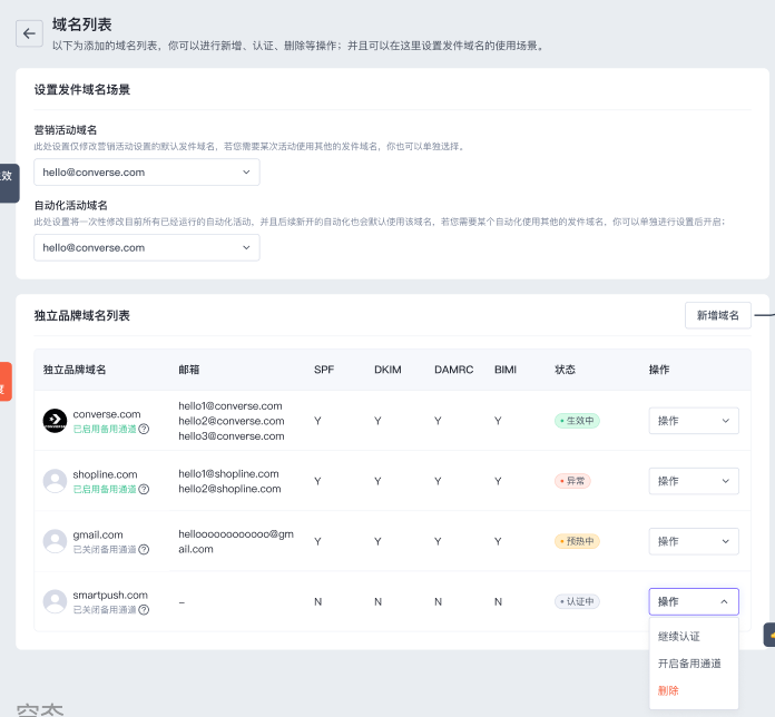 SmartPush支持一次性帮助商家独立域名完成4个身份认证,无需反复操作;