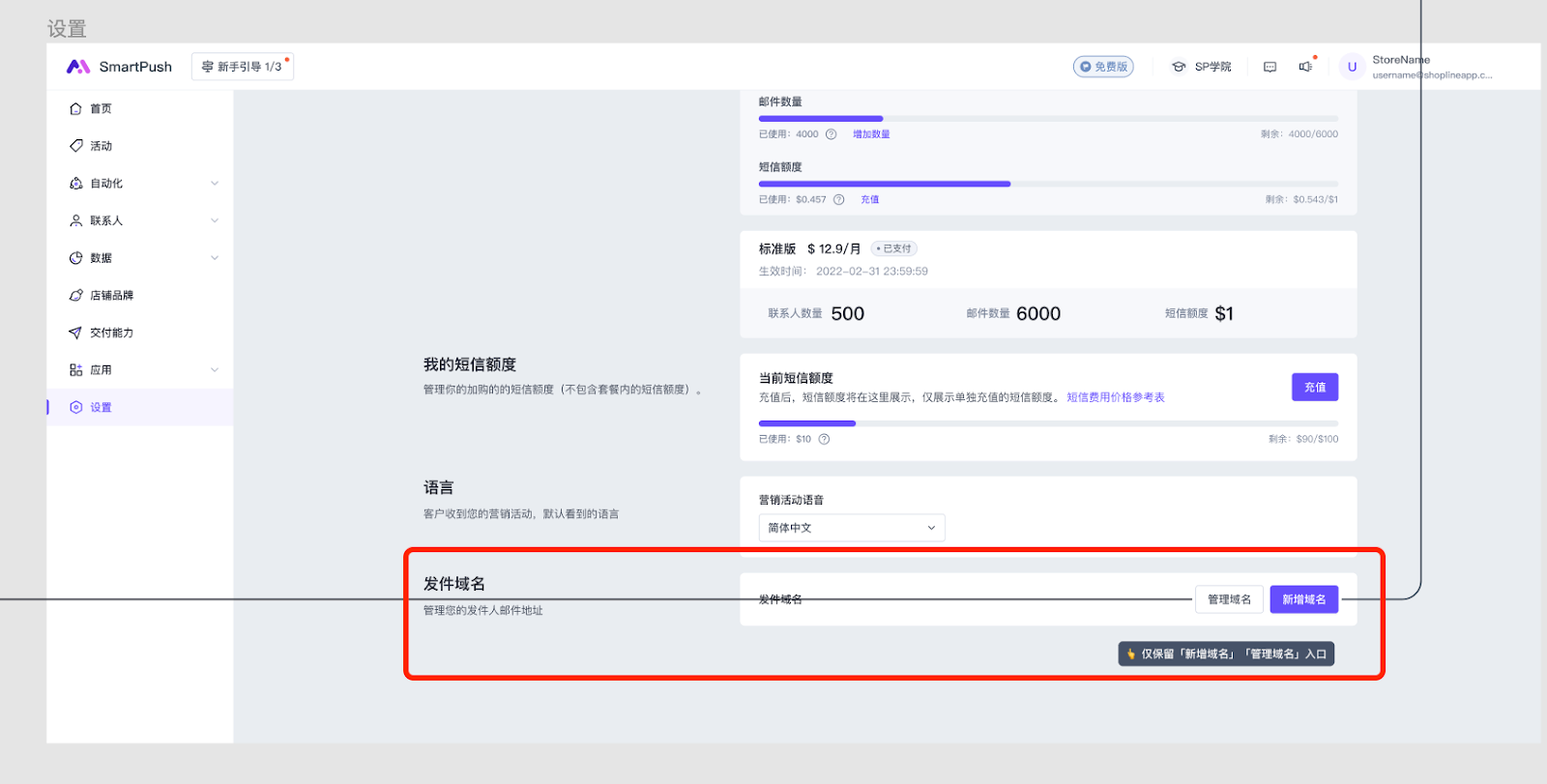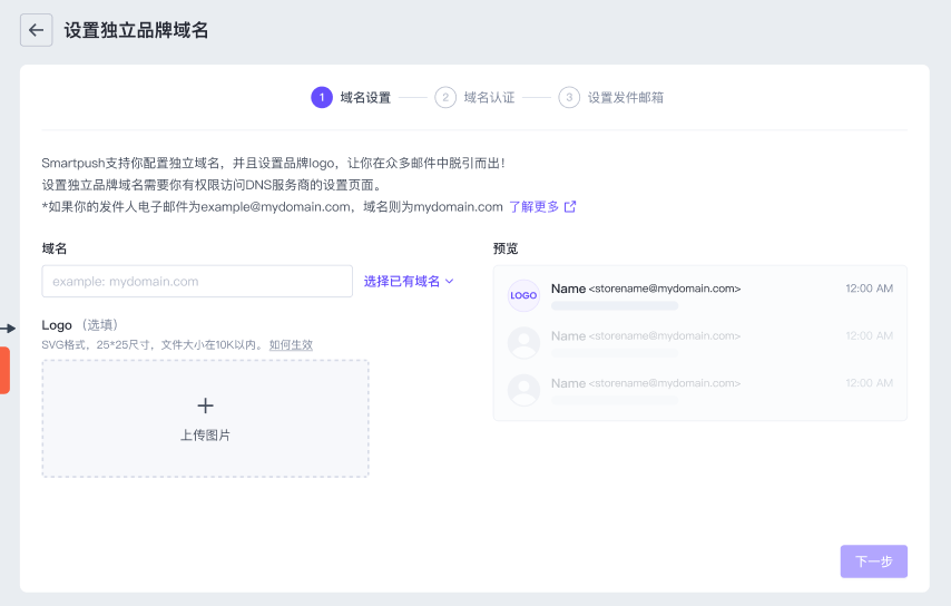 - 若您的联系人量级超过30万以上,我们建议可以认证多个二级子域名进行分开下发,例如:@info.storename.com、@news.storename.com、@email.storename.com等。