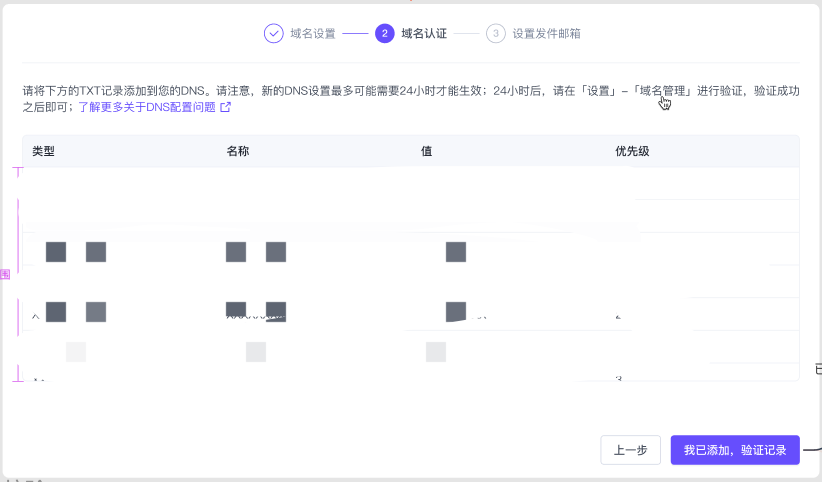 - 新的DNS设置最多可能需要24小时才能生效,你可以从「域名管理」页面继续进行认证【验证记录】;