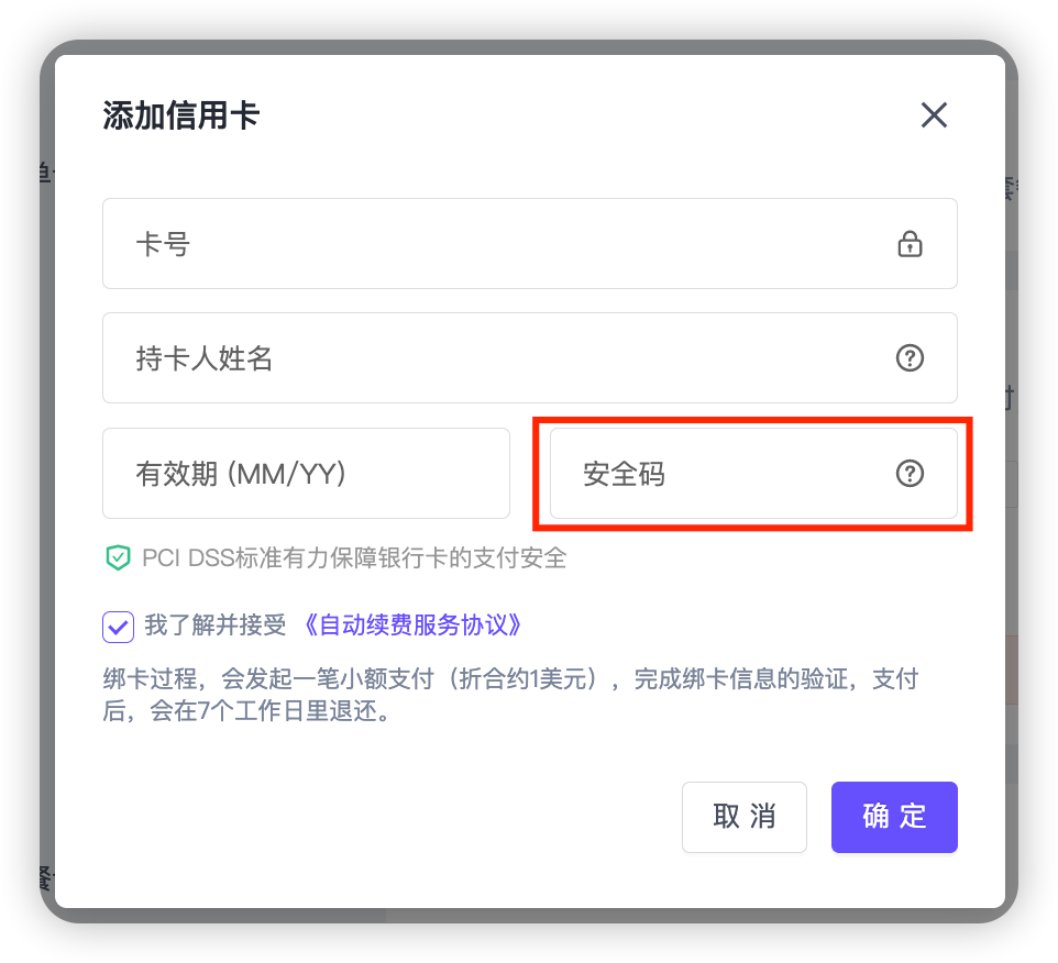 需将正确的信用卡安全码对应填写到标红的输入框中,如上图所示。