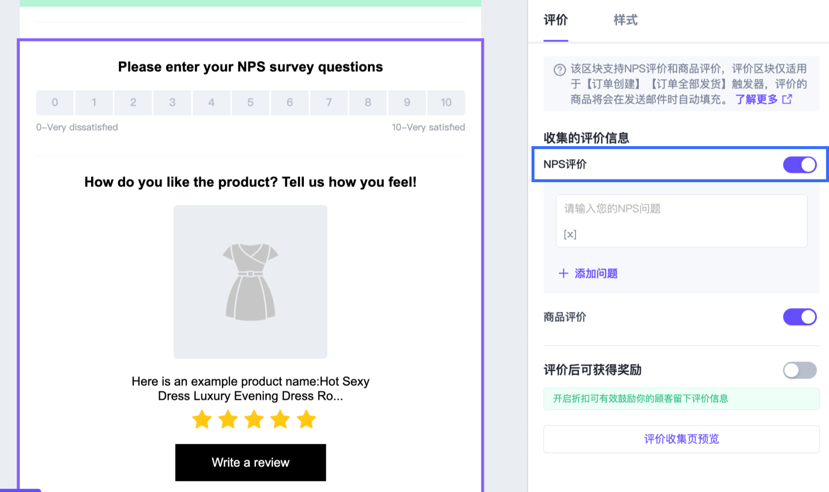 - 同时收集商品评价和 NPS 评价