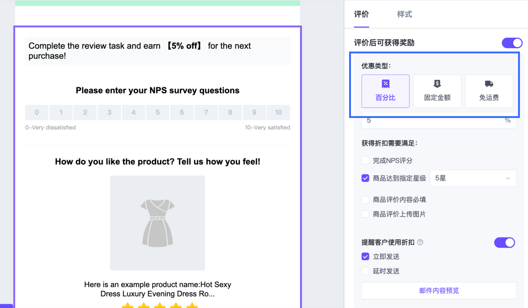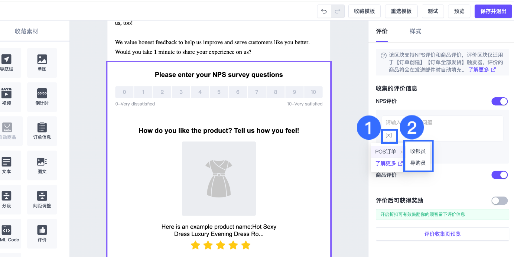 SmartPush 的评价区块允许您通过自动化工作流收集商品评价和服务(NPS)反馈,同时为完成评价的顾客提供奖励。