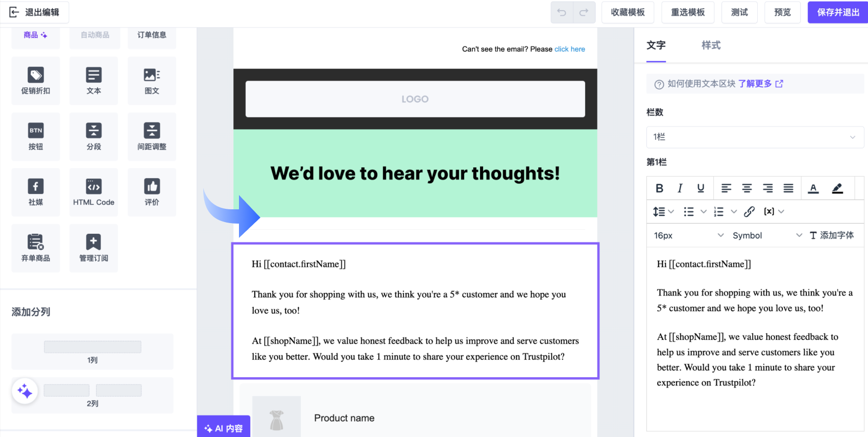 如果所选触发条件无法提供订单数据,则评价区块不会在邮件中显示。