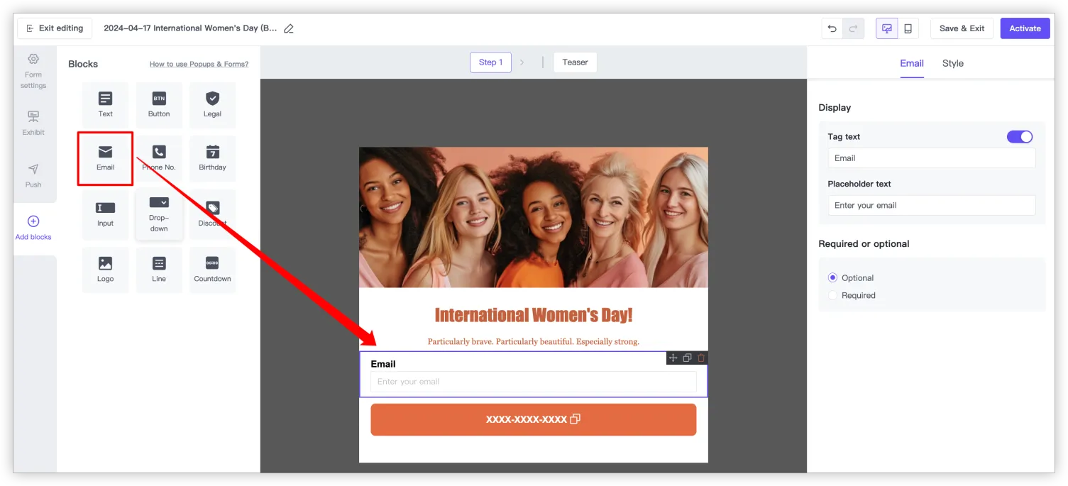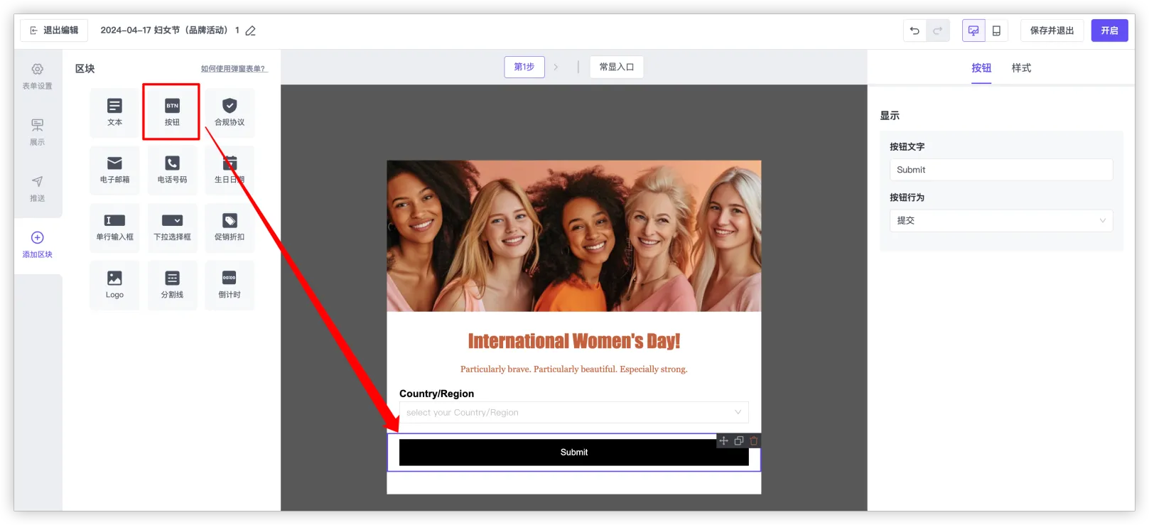 在左侧边栏上,您将能够选择特定内容项并将其拖放到表单内容中。为了完善您的注册表单,您可以添加电子邮箱输入框、电话输入框、日期输入框、单行输入框、下拉选择框、文本、按钮、合规协议,也可以修改图片、插入折扣码。