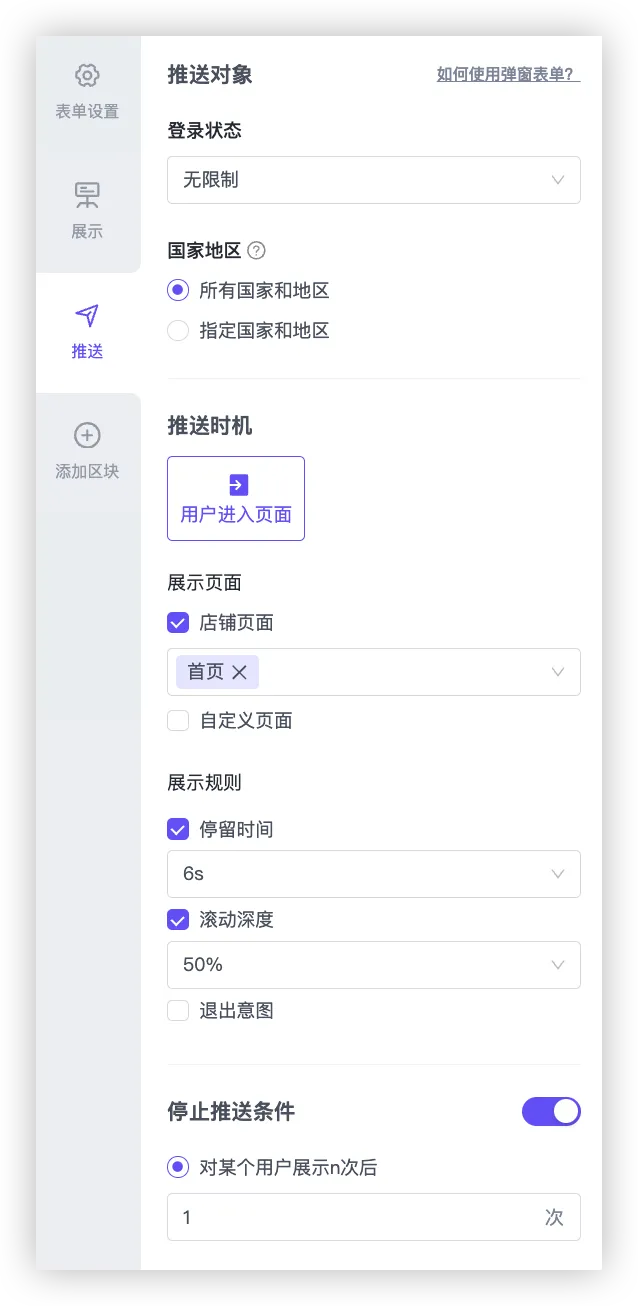 - 展示规则是指用户在页面达到展示规则即可触发弹窗,包括停留时间、滚动深度、退出意图。停留时间是指访问者需要在您的网站上花费的时间(以秒为单位)才能显示表单;滚动深度是指用户需要在页面上滚动多远(以百分比为单位)才能显示表单;退出意图是指用户即将离开页面时出现,通过用户行为来跟踪:PC端用户鼠标移动至页面顶部时/鼠标悬停在桌面视口顶部上方时,移动端用户从左向右滑动屏幕、点击返回视为退出意图。