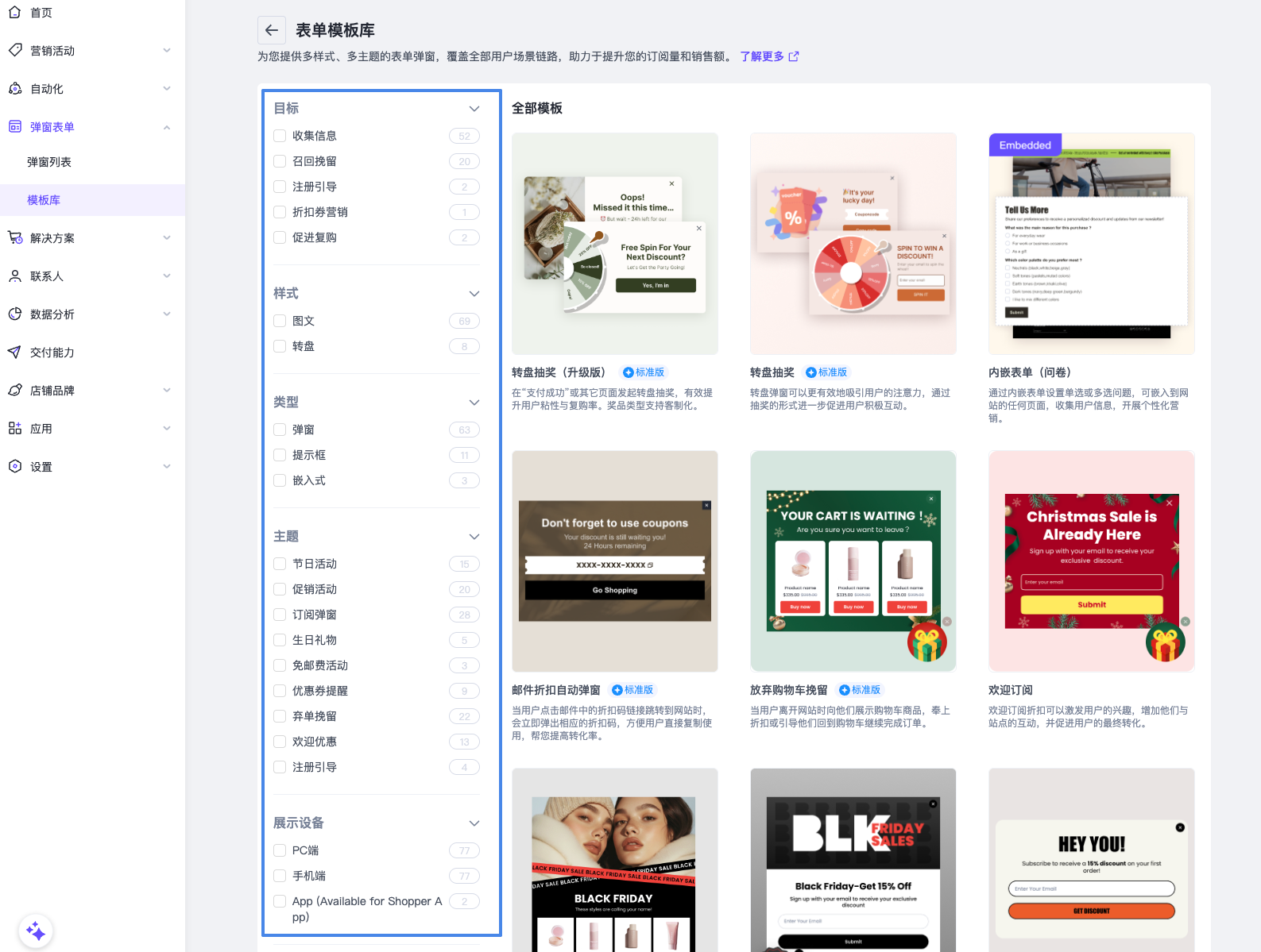 例如 转盘弹窗模板,通过游戏化互动方式吸引顾客参与,提高订阅和互动率。