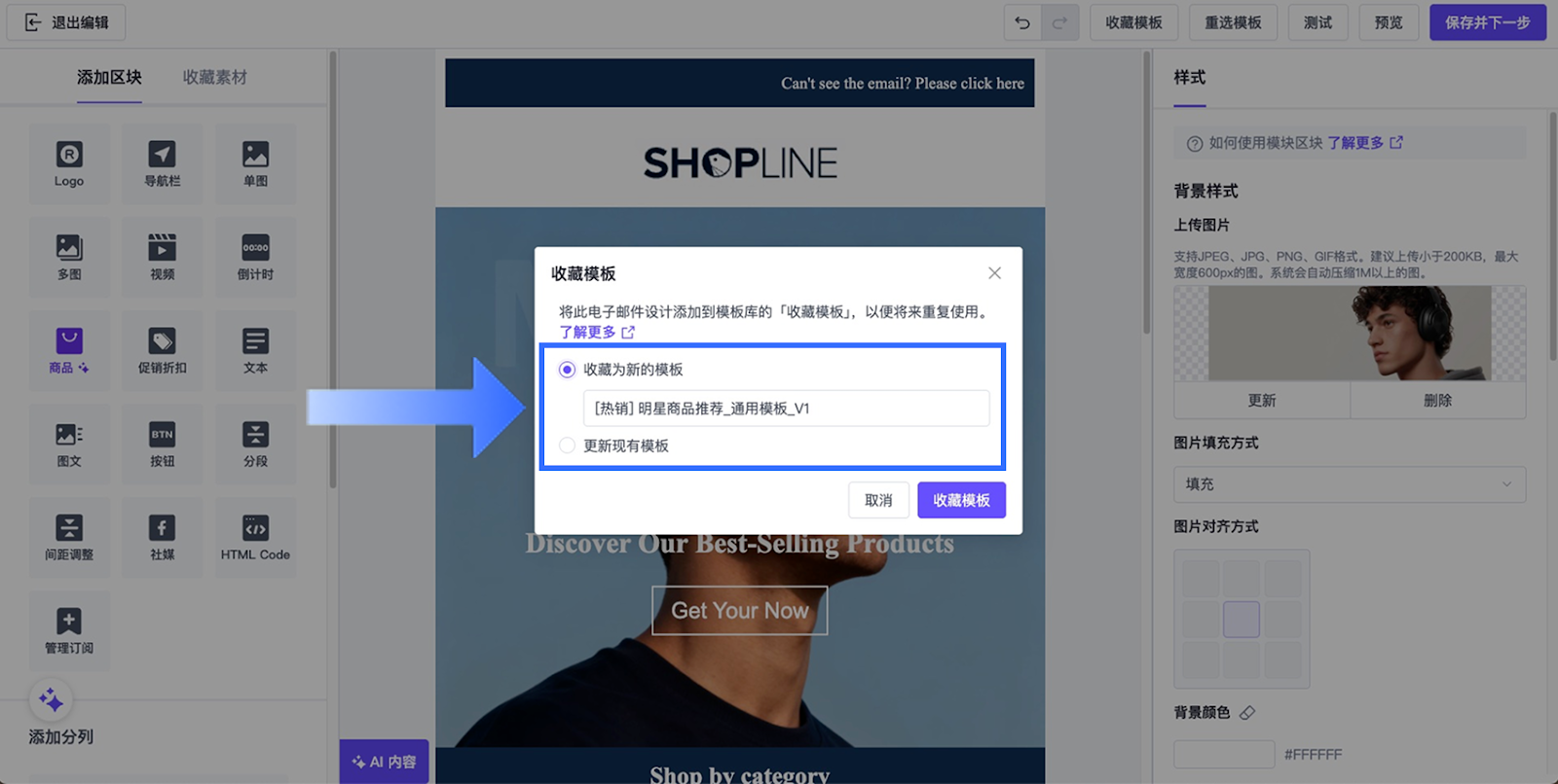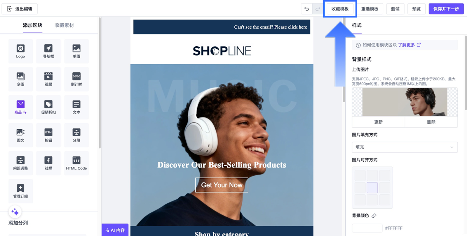 创建或编辑您的电邮内容。完成设计后,在编辑器顶部点击【收藏模板】。