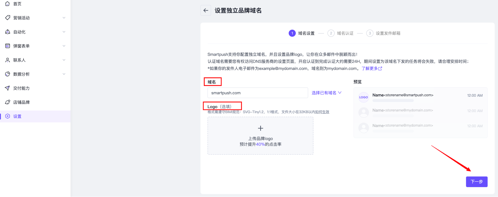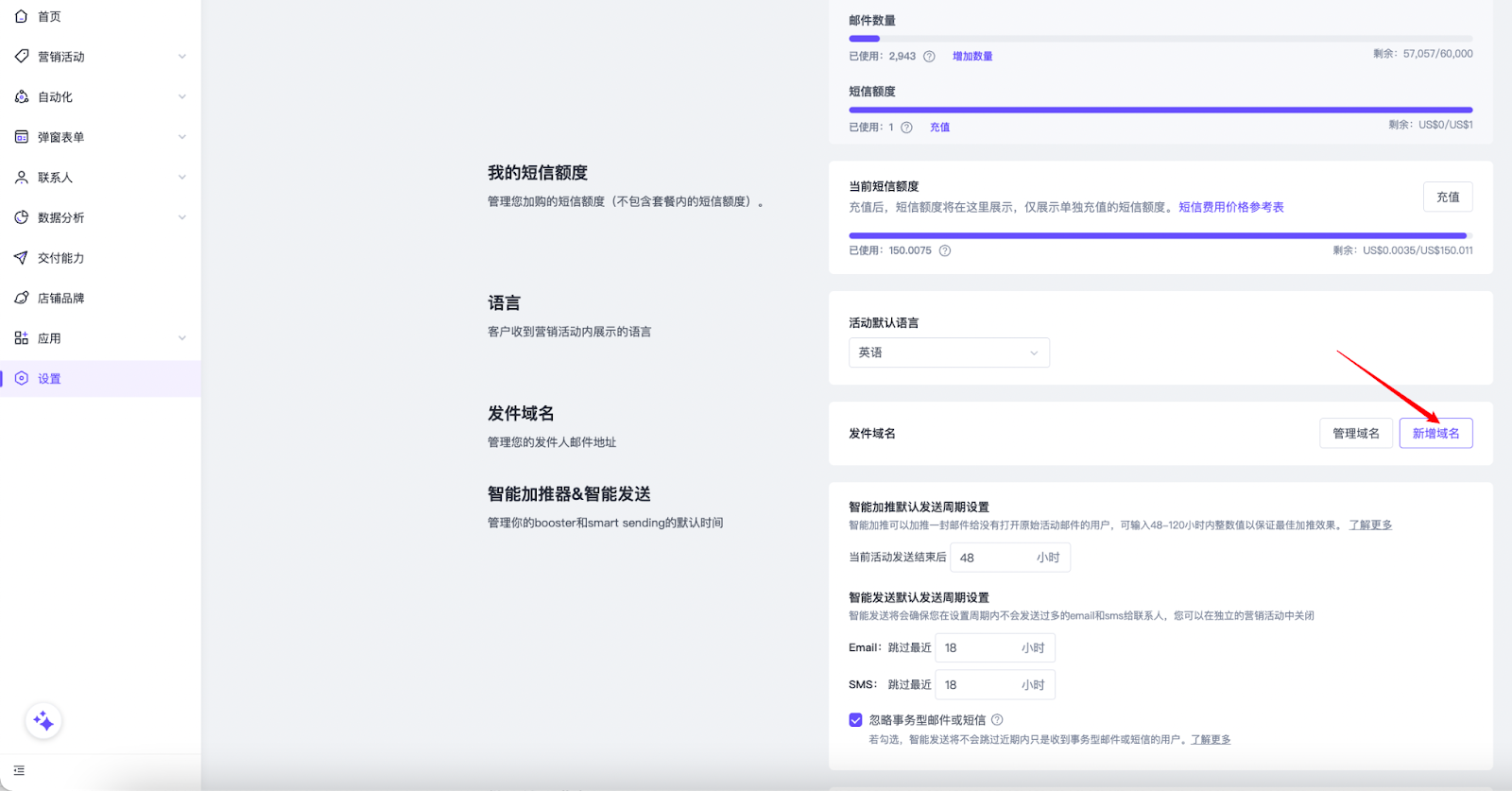 在SmartPush平台的“设置”栏位,所有经过真实性验证的发件地址都将汇总到此处,您可以在此管理您平台的所有发件邮箱和域名。