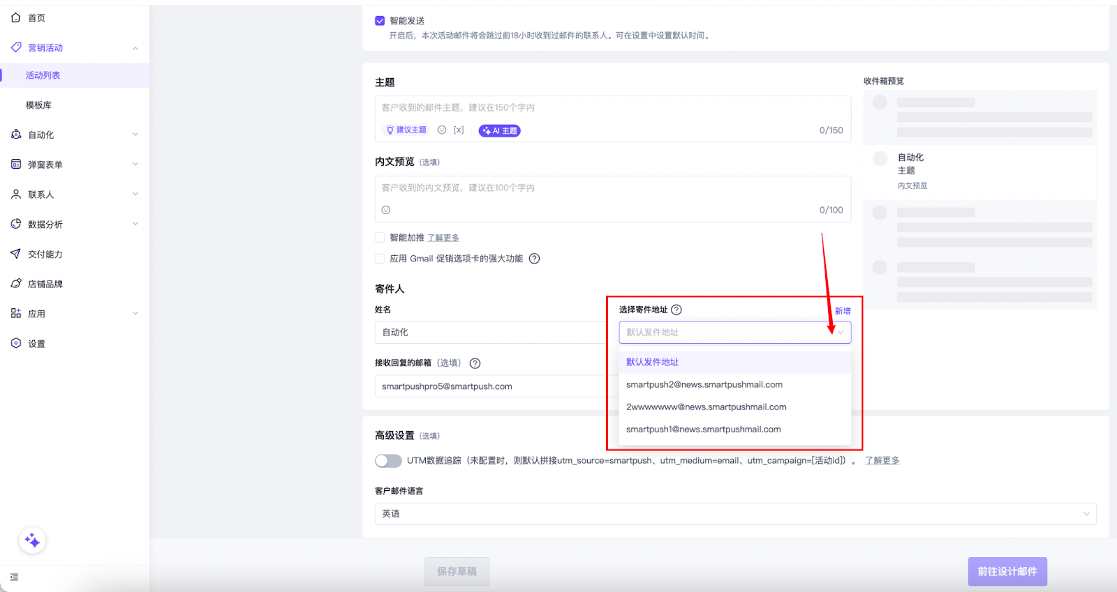 4. 认证成功后即可设置发件邮箱。编辑营销邮件时点击“选择寄件地址”下拉栏,将默认发件地址更改为您所设置的发件邮箱。