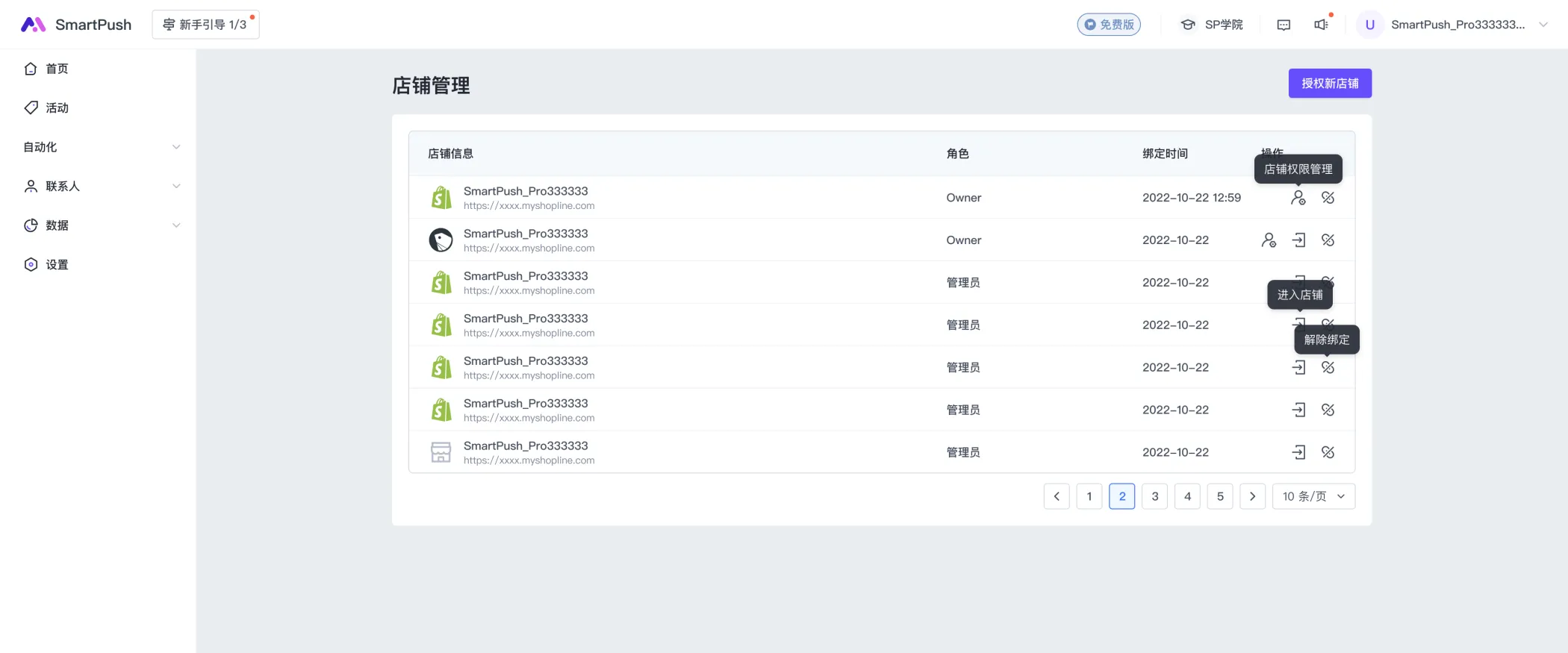1. 点击右上角头像,> 【店铺管理】,您可以看到您绑定的所有店铺、您的角色、绑定时间。