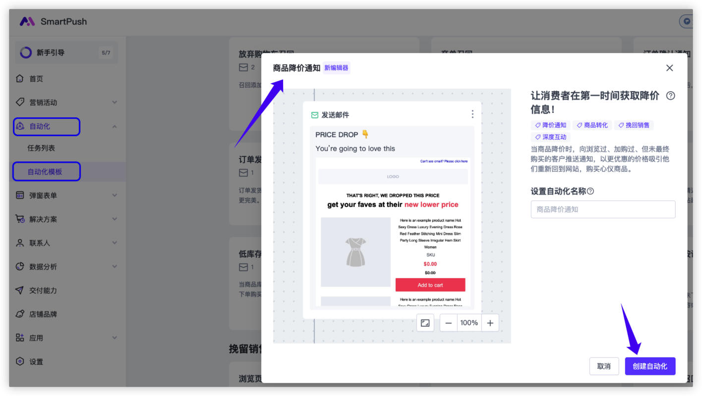 开启路径:SmartPush左侧导航-自动化-自动化模板-创建【商品降价通知】