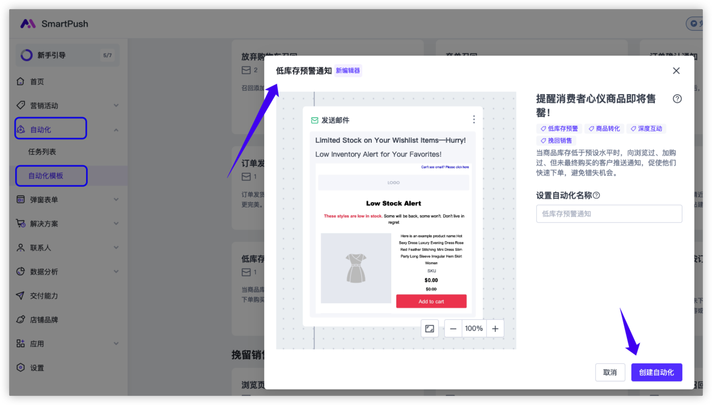 开启路径:SmartPush左侧导航-自动化-自动化模板-创建【低库存预警通知】