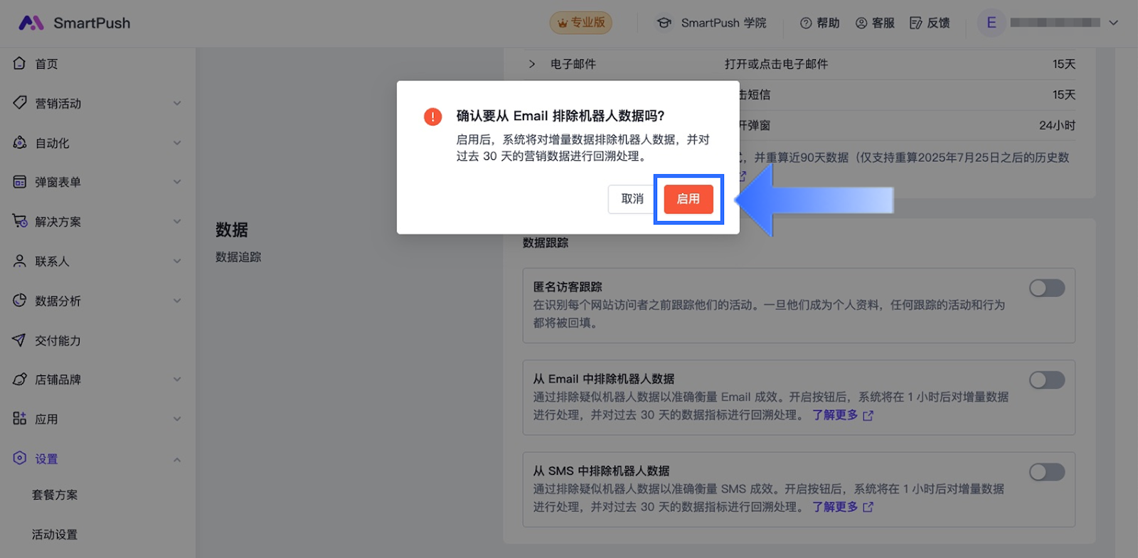 启用排除机器人数据功能