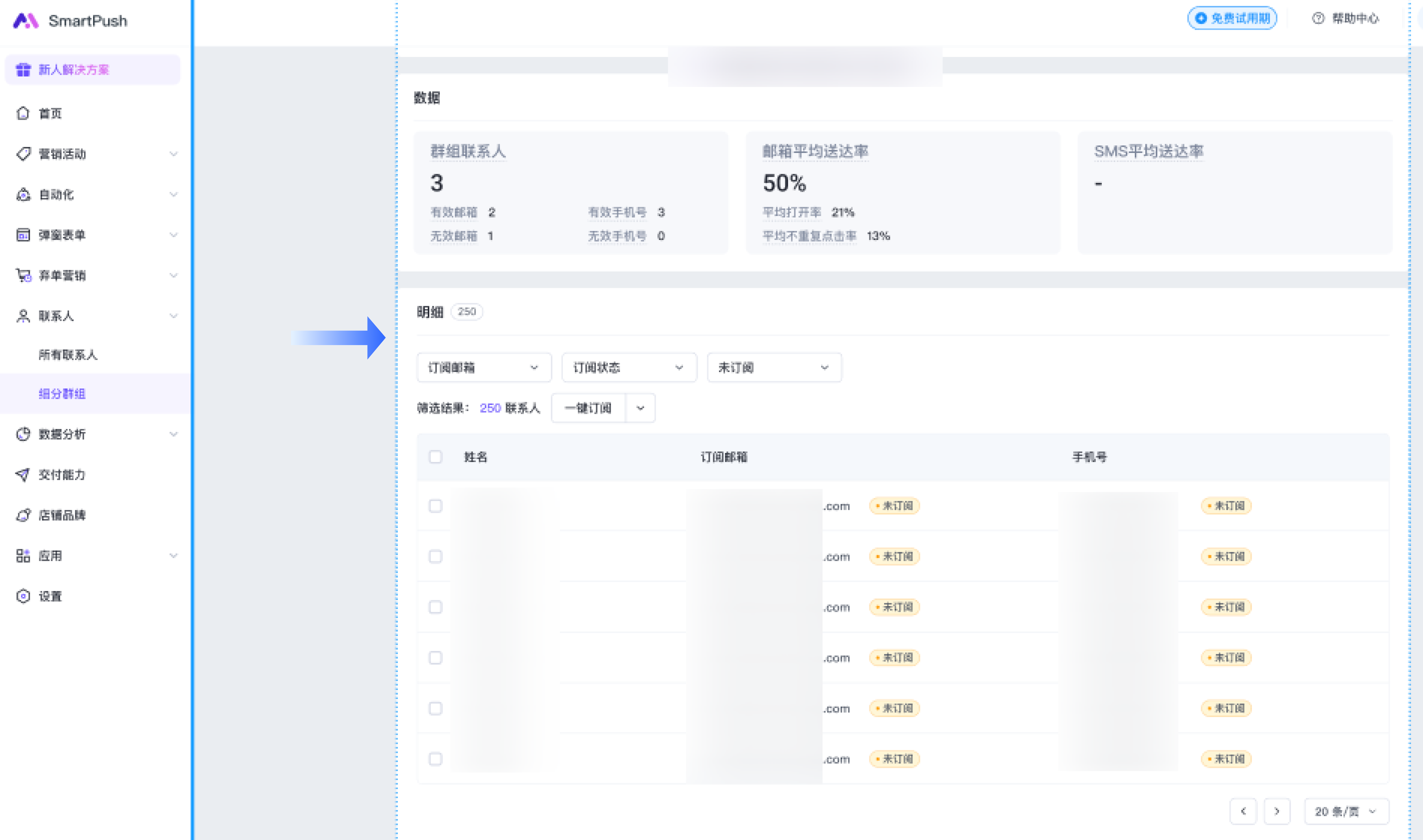 在您的 SmartPush 插件左侧菜单,点击 【联系人】 > 【细分群组】