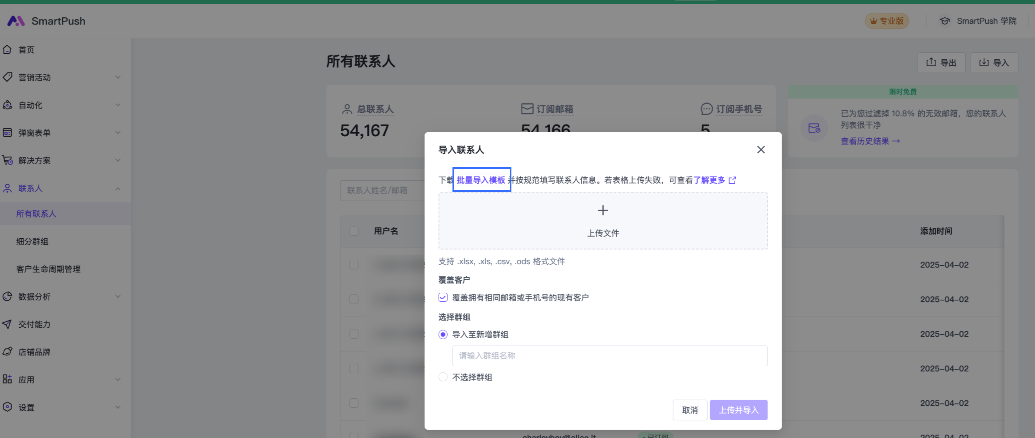 SmartPush 支持商家通过文件导入联系人并设置其订阅状态,便于后续进行精准营销操作。为提升使用体验,系统提供批量变更订阅状态的功能,并优化了导入模板结构,简化操作流程。