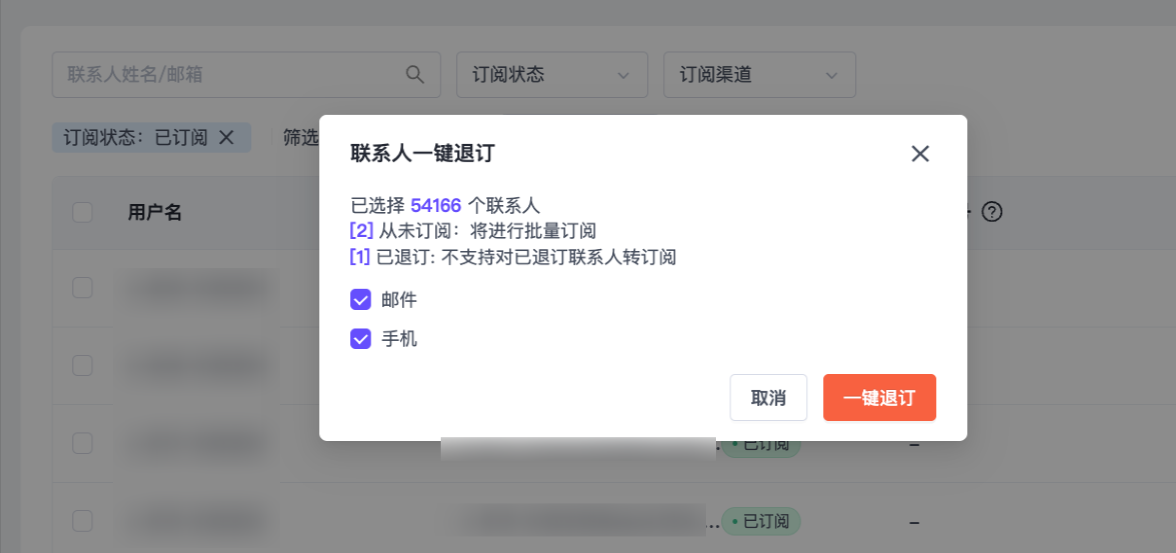 备注:仅对已授权接收营销信息的联系人可进行订阅操作。已退订的联系人无法重新订阅。 |