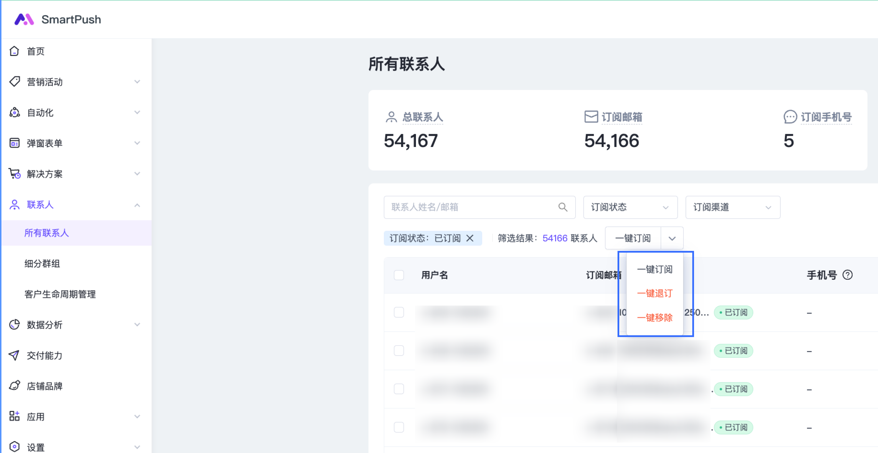 - 删除联系人:仅在 SmartPush 中删除,不影响平台数据。