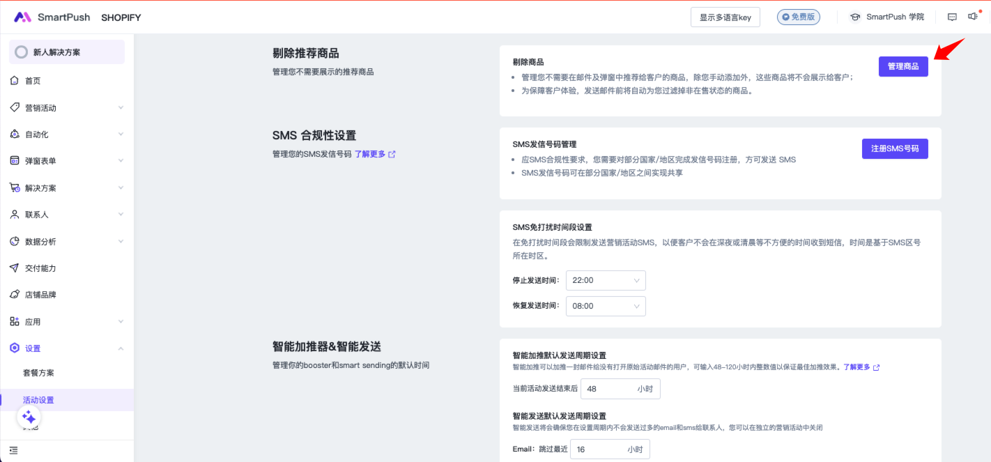 开启路径:SmartPush左侧导航-设置-活动设置-【剔除推荐商品】-【管理商品】