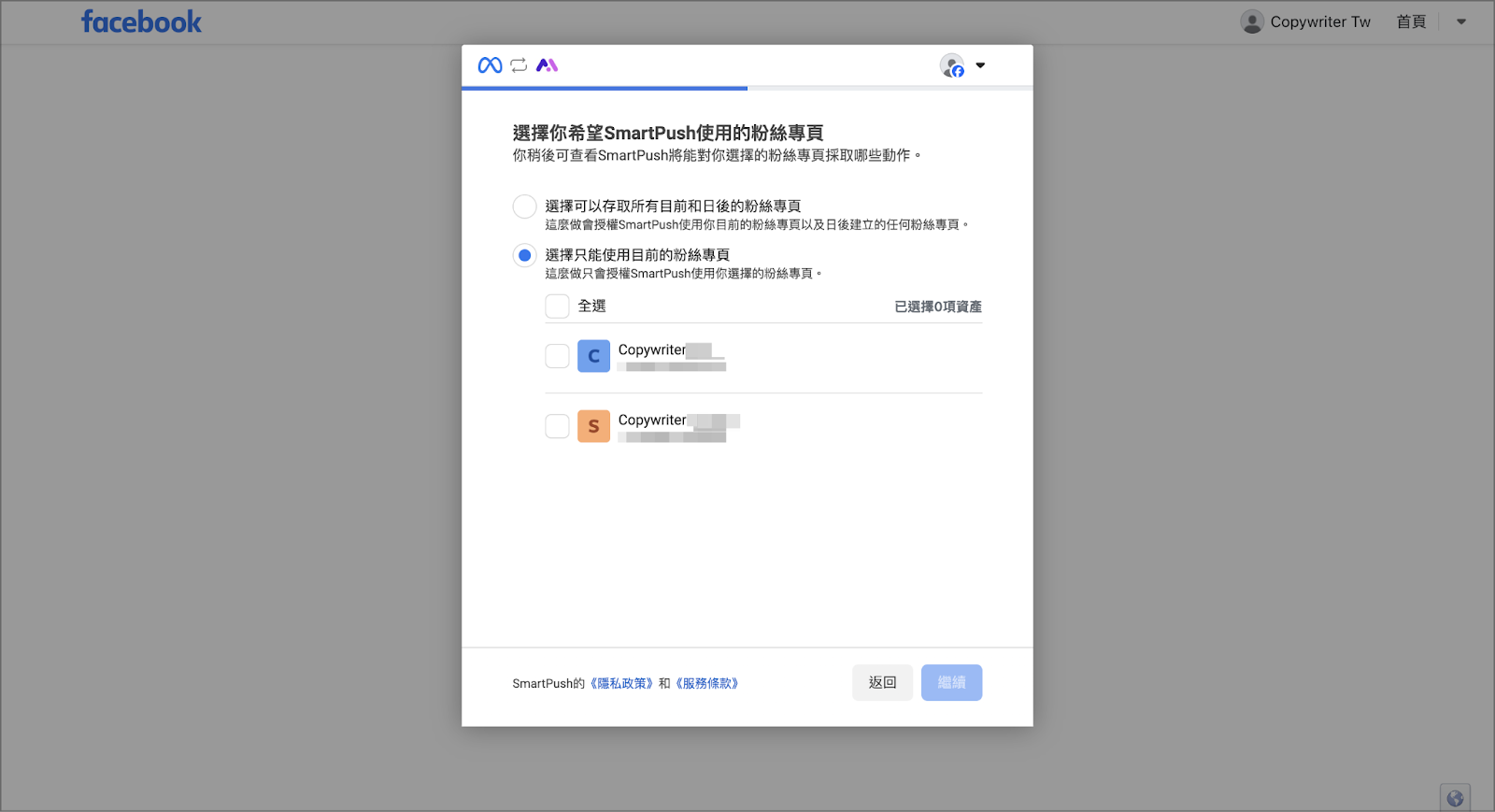 - 按照弹窗指引,选择您要授权的 商务管理平台 (BM) 和 Facebook 公众主页。