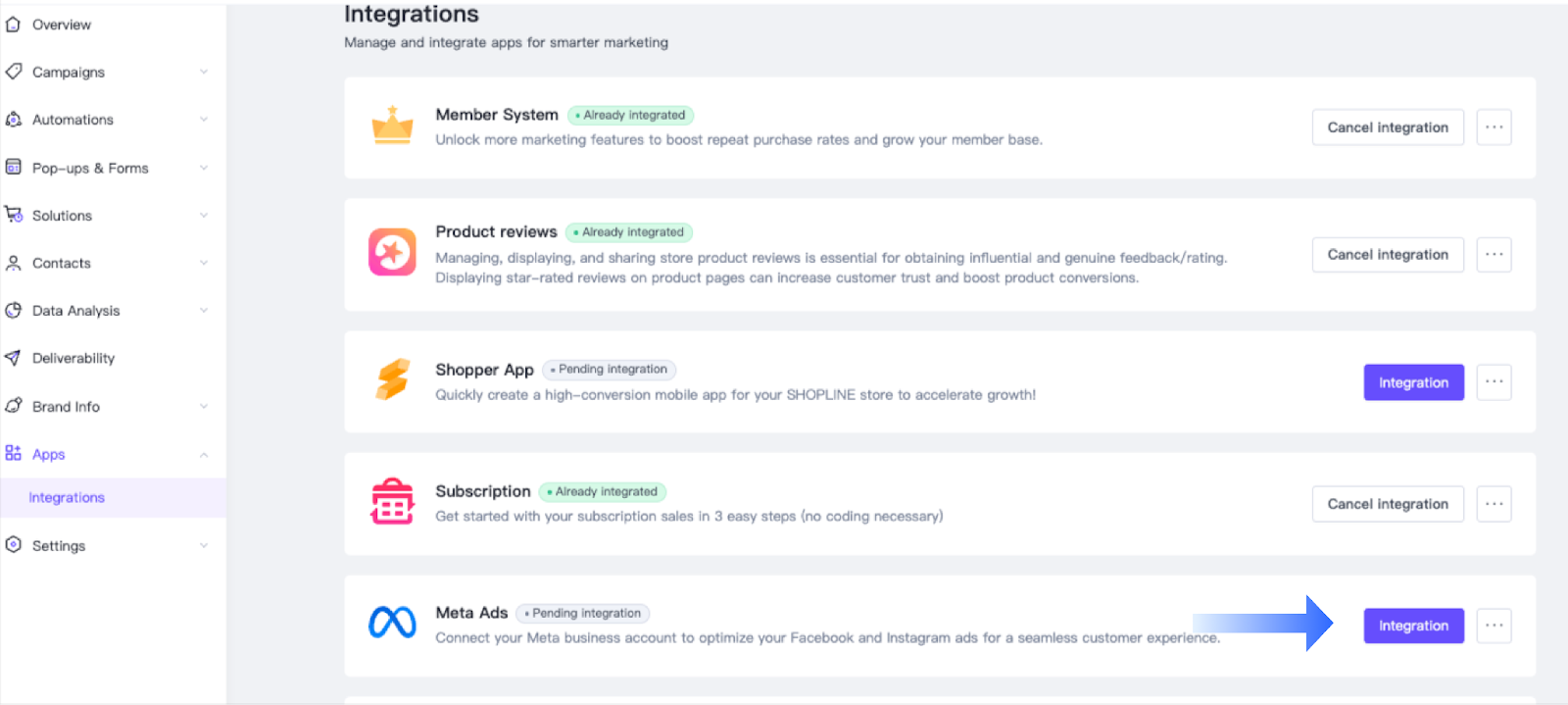 - 进入 应用 > 集成。在 Meta Ads 列表点击 “...” 图标并选择 设置。
