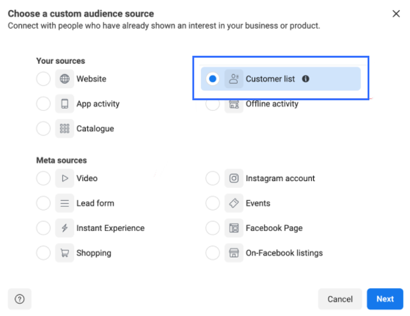 - 受众类型限制: 仅支持同步 Meta 中类型为 客户名单 (Customer List) 的受众。