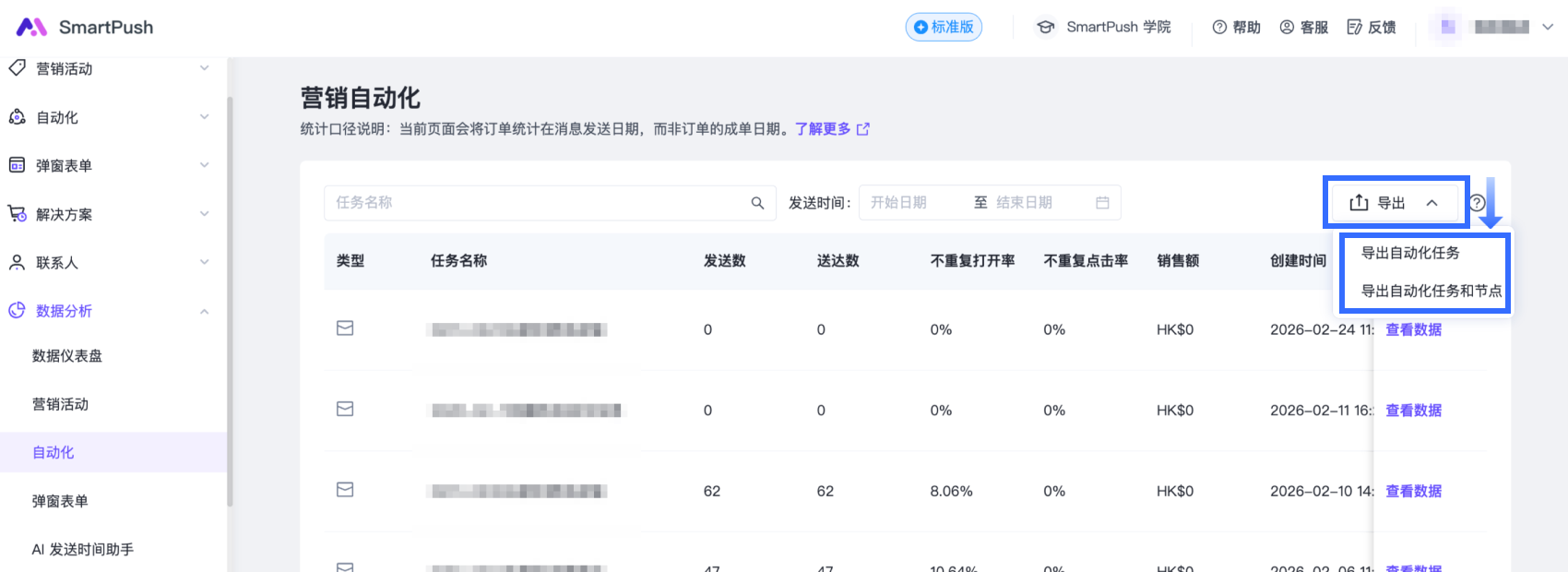 自动化概览数据页面为您集中展示 SmartPush 中自动化流程的整体表现。通过更清晰的指标定义、统计周期(发送时间)筛选器,以及优化后的导出逻辑,您可以更准确地了解自动化所带来的互动与销售成效,并避免常见的数据不一致问题。