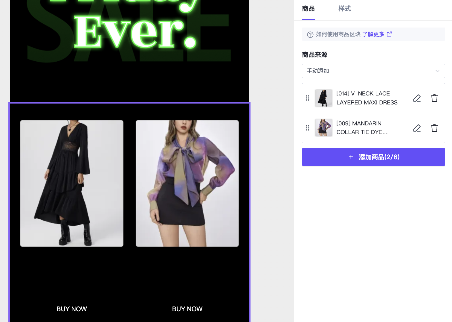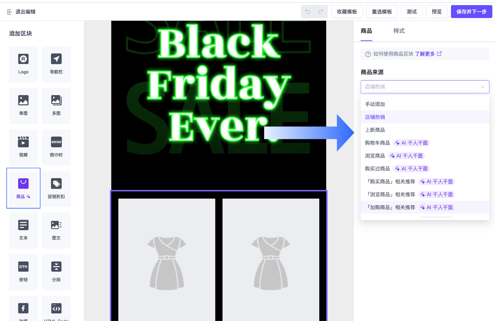 在 SmartPush 的邮件编辑器中,您可以通过「内容」组件区添加「商品」模块,快速插入商品卡片以提升视觉吸引力与用户点击意愿。