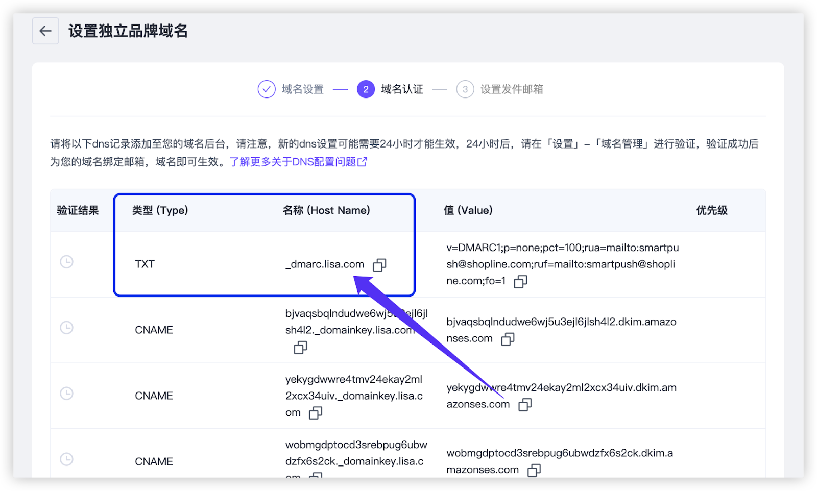 例如:期望的DNS记录名称为 _dmarc.smartpushedm.com,输入的记录名称为 _dmarc.smartpushedm.com,服务商自动加入主域名后缀后 实际的记录名称为 _dmarc.smartpushedm.com.smartpushedm.com。这样就会导致验证DNS失败。