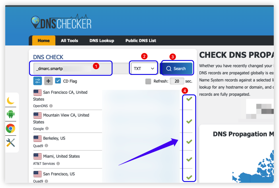 2、将名称复制到第三方工具dnschecker(点击跳转)中,同时选择其对应的类型,如TXT,点击按钮