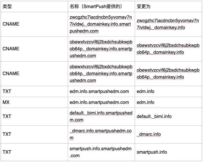 当您添加记录时,SmartPush给您提供的是左列的内容,您需要自行删除名称列中的主域名smartpushedm.com ,添加右列的内容到您的DNS后台。