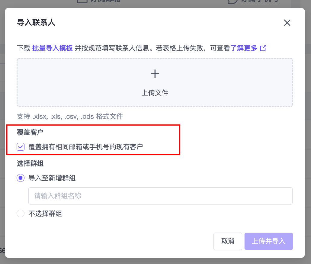导入时,若勾选“覆盖拥有相同邮箱或手机号的现有客户”,则当导入的联系人在已有联系人内已经存在时,将进行新内容覆盖。