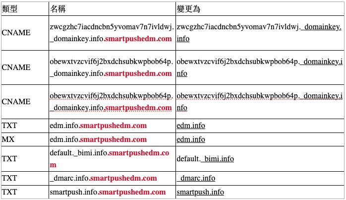 範例:DNS 記錄,域名地址為 info.smartpushedm.com