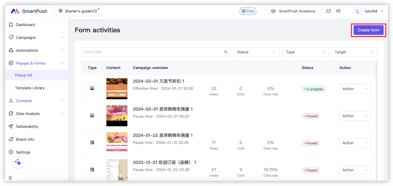 您可以前往「彈窗表單 > 彈窗列表」頁面查看您設定的表單活動,活動概覽區塊顯示「瀏覽量、點擊和點擊率」,狀態欄位有「草稿、待開始、進行中、暫停中、已結束」五種狀態,對應的操作包括:
