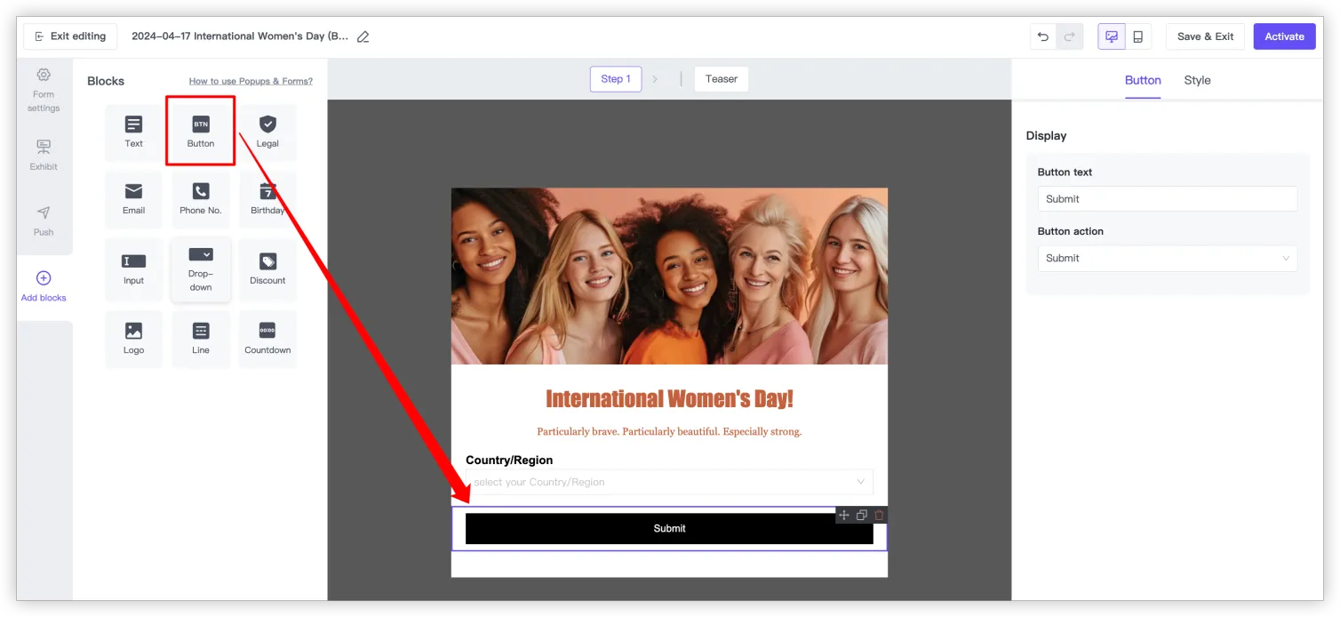 - 須在顧客提交資訊的彈窗「第 1 步」頁面配置「電話號碼」或「電子郵箱」區塊。