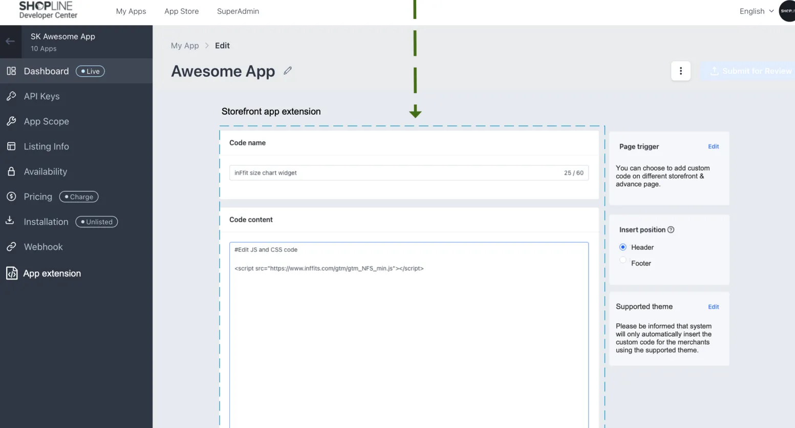 在開發者入口網站中,您可以選擇要渲染腳本的主題、頁面或位置,在下方螢幕截圖中,您可以看到右側的三個區塊,分別是: