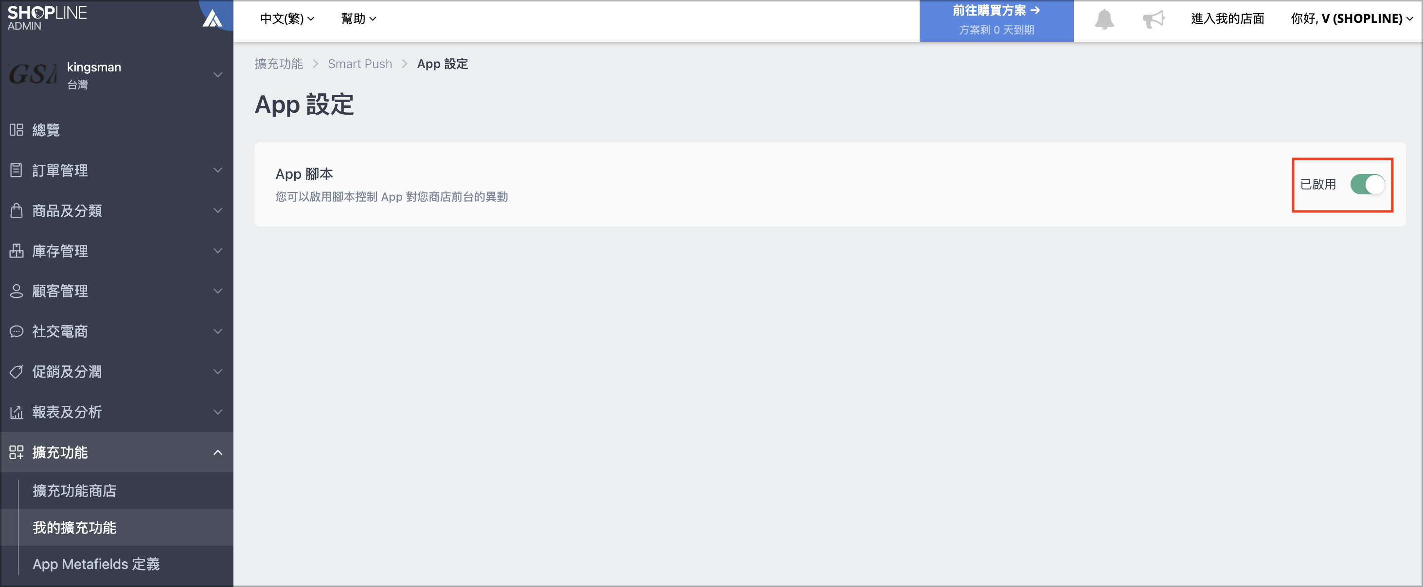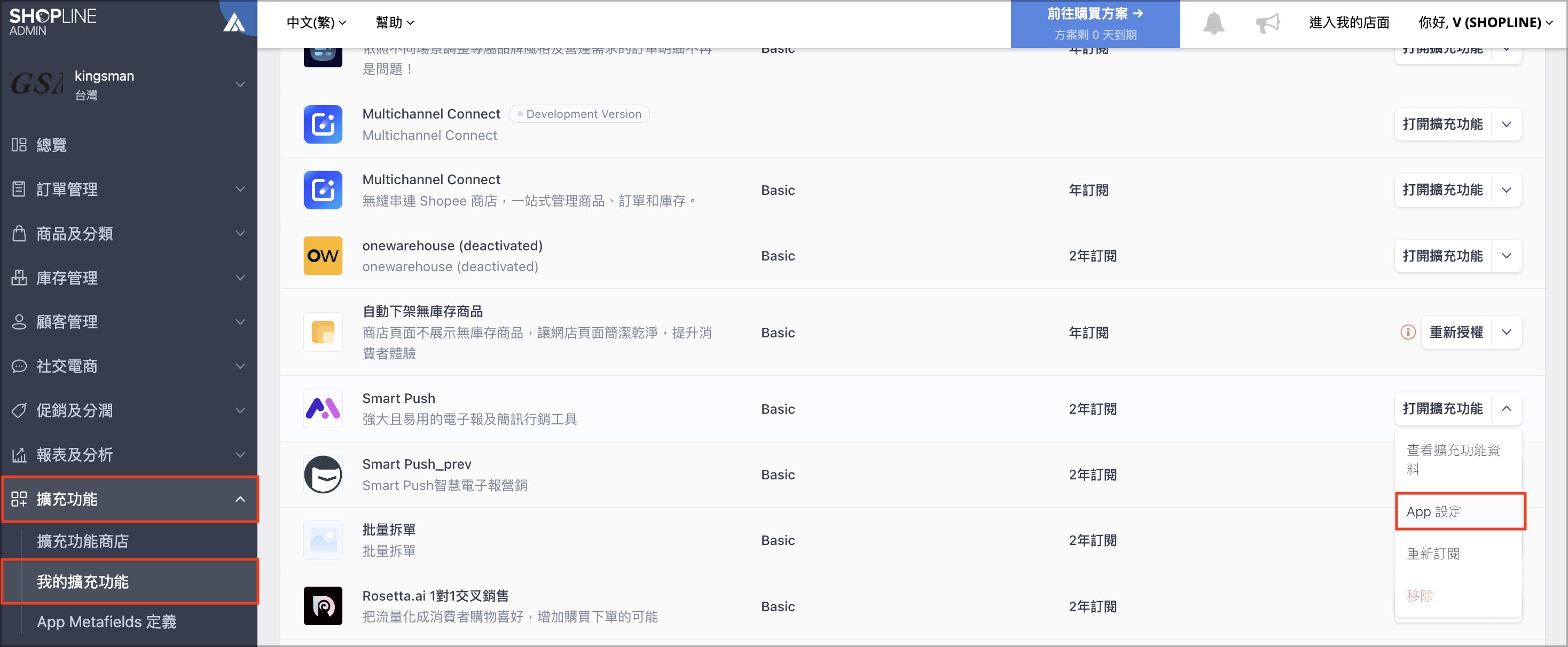 若您的商店後台連結為 shopline.com,您需要前往 SHOPLINE 後台 > 擴充功能 > 我的擴充功能,點選 SmartPush 右側的下拉選單,再點選「App 設定」。