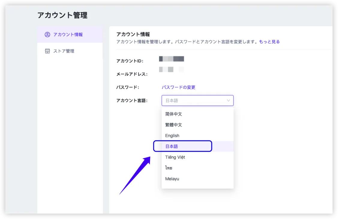 2. 系統語言支援日語,前往右上角「帳戶名稱 > 帳戶管理 > 帳戶語言」進行設定。