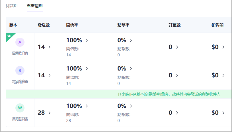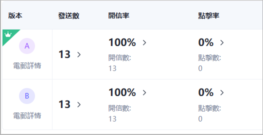 可點按「類型」篩選出「郵件 A/B 測試」的數據報告。