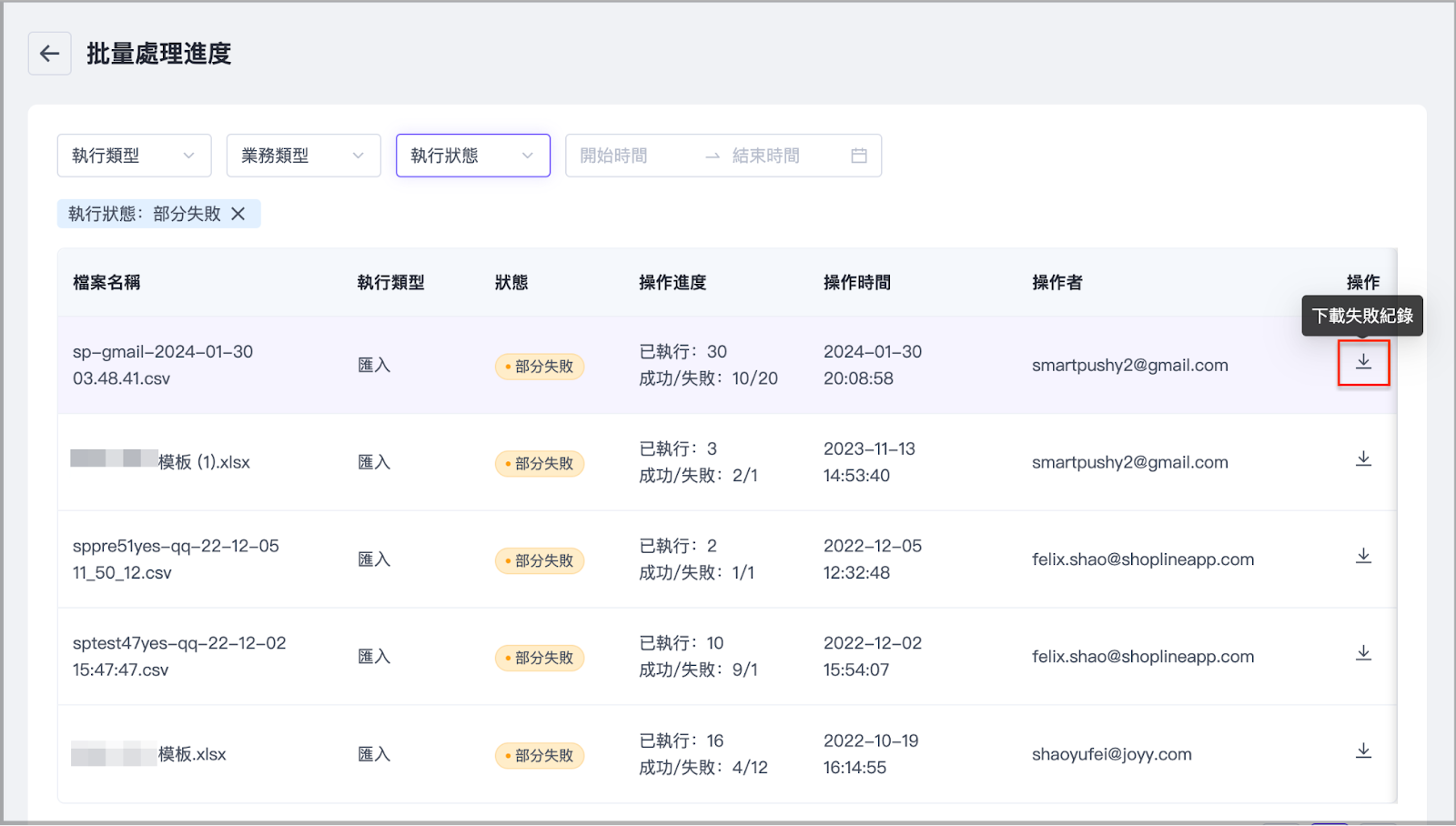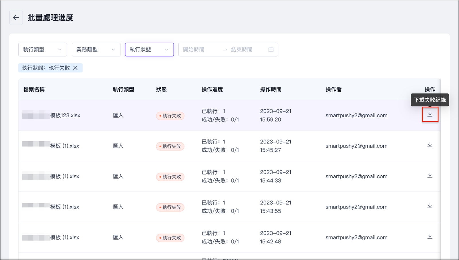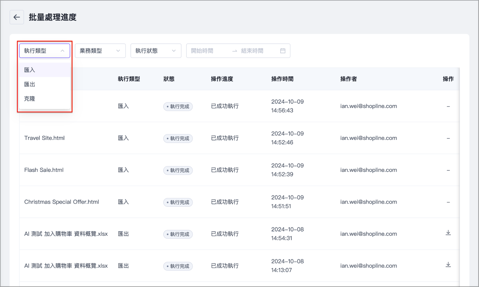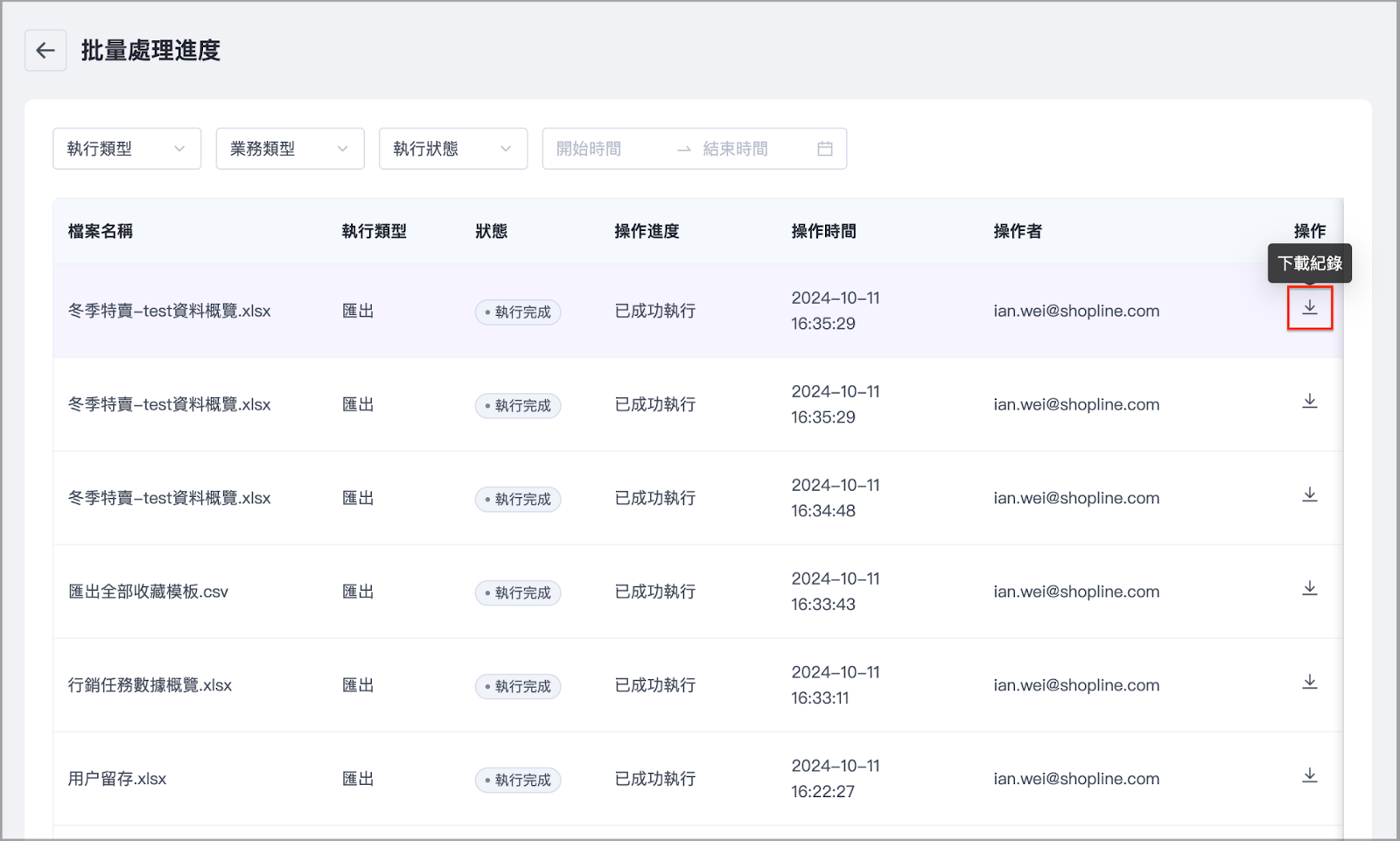 您能從批量處理進度頁面管理所有匯入、匯出等批量處理活動,以下將介紹如何操作「批量處理進度」頁面。