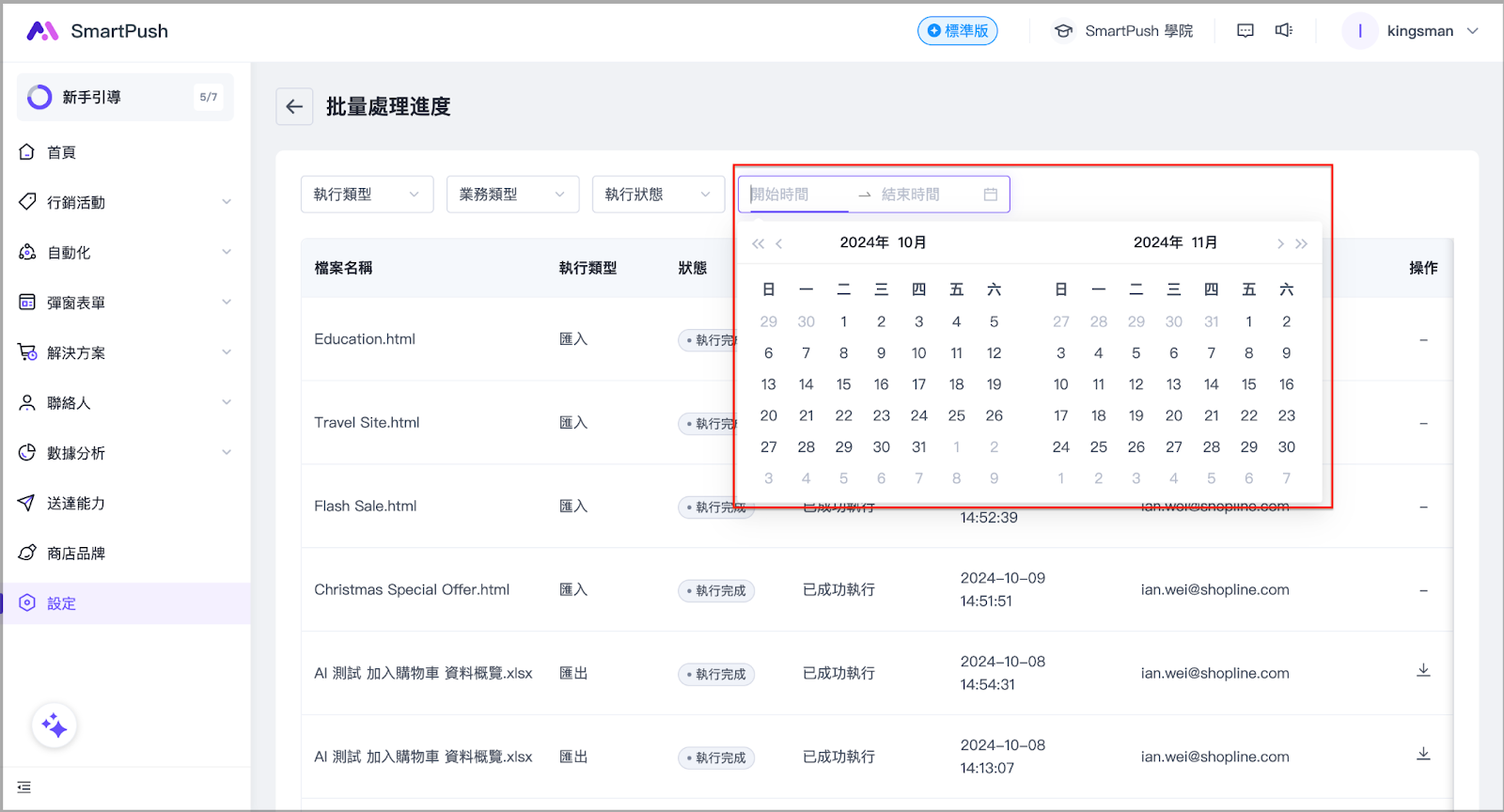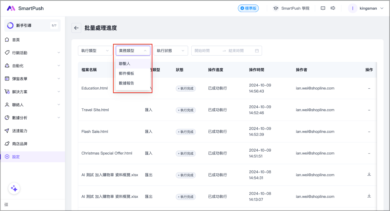 Smartpush 中所有數據匯入/匯出皆可在「批量處理進度」頁面查看,可管理的數據範圍包含: