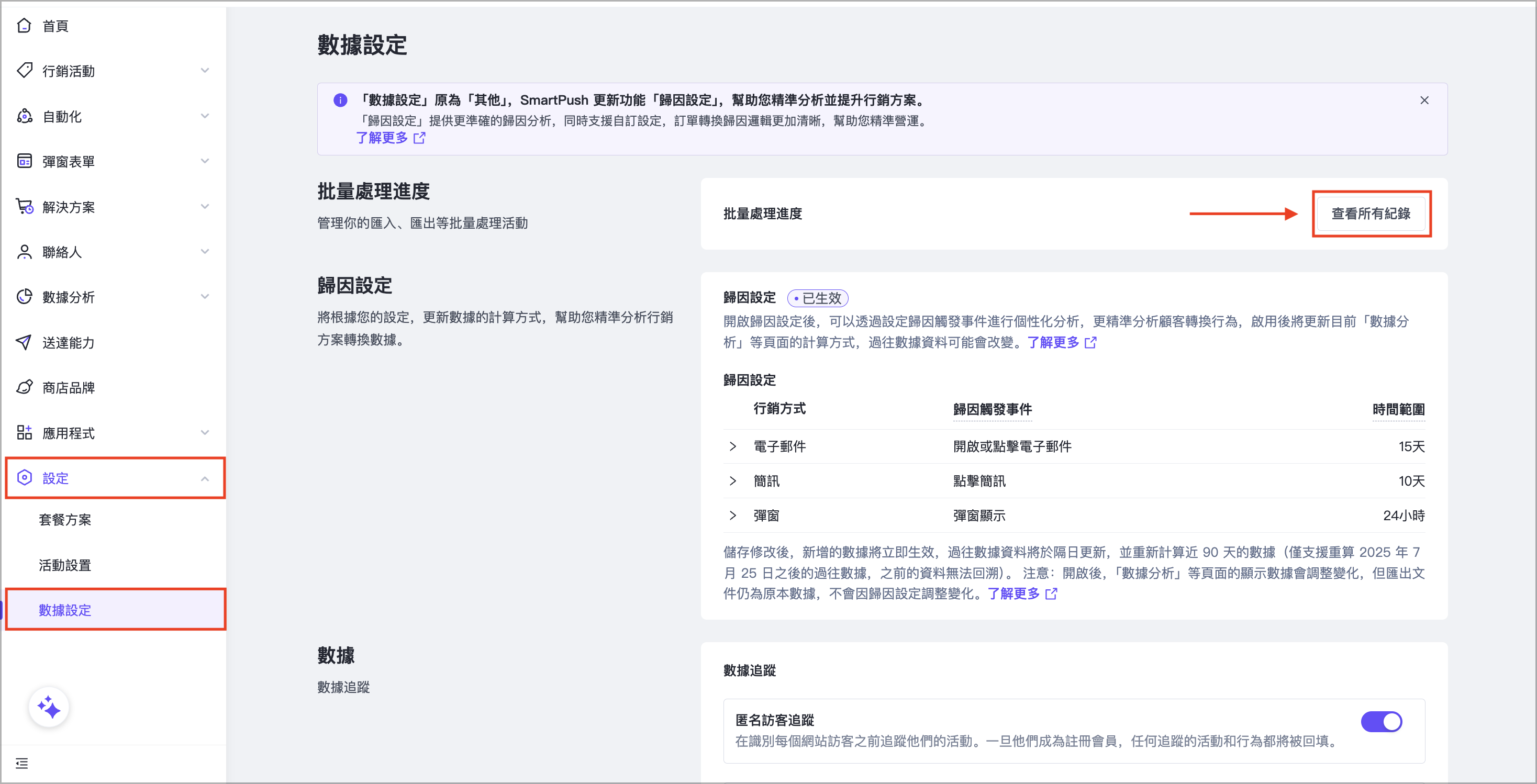 前往「設定 > 數據設定」,於「批量處理進度」中點選「查看所有紀錄」,進入批量處理進度頁面。