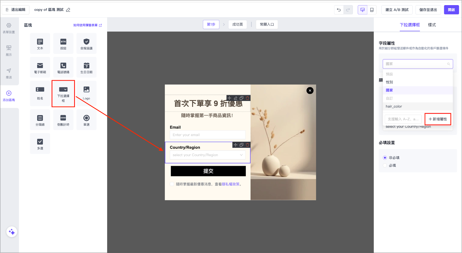 功能說明:自訂標籤功能全新優化!您可以自訂想要收集的用戶資訊,例如:膚質、頭髮顏色等,讓表單更貼合您的個性化需求。