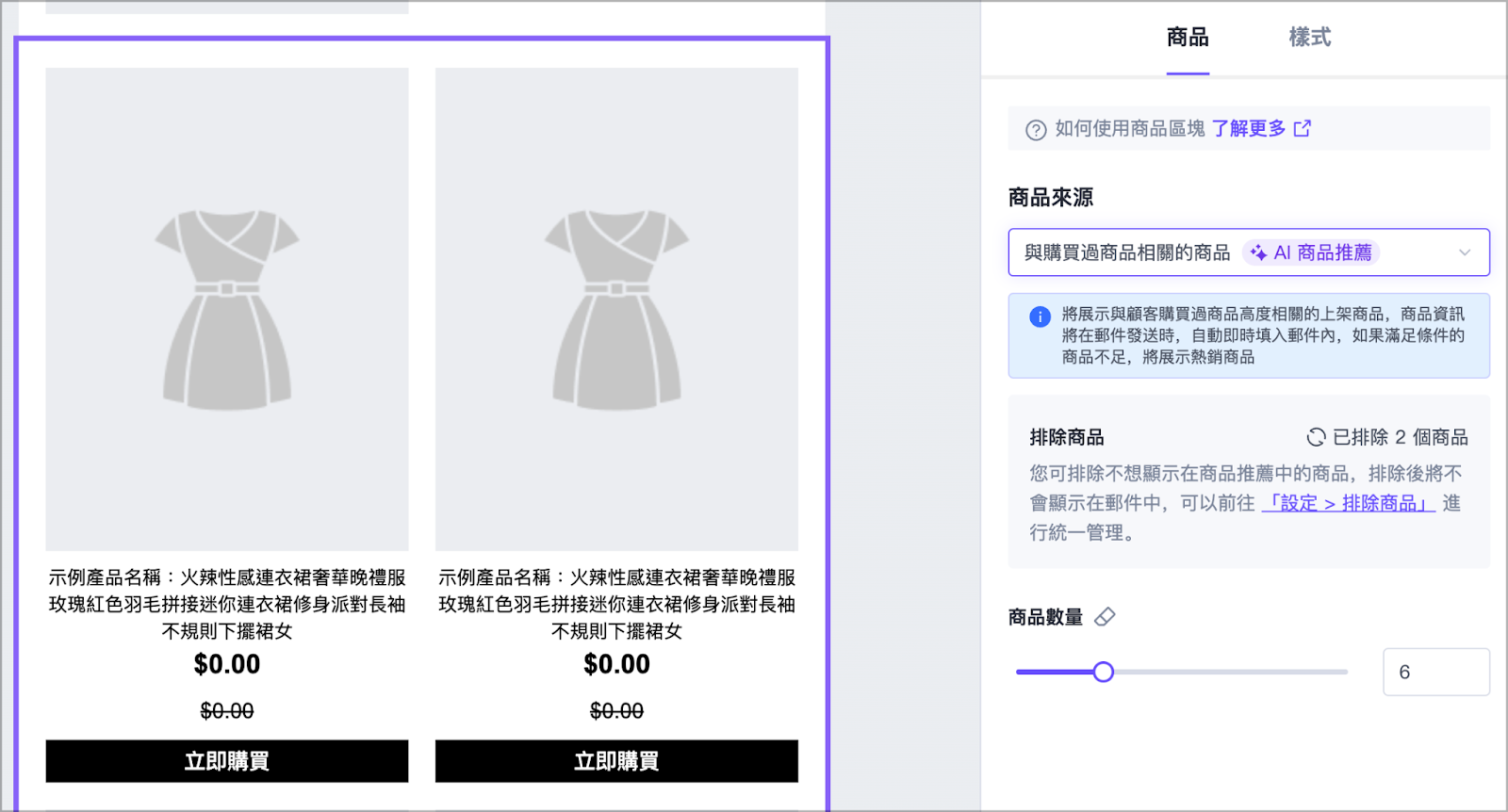 功能說明:SmartPush 全新推出排除商品功能,手動將特定商品排除後,系統將自動在郵件、自動化郵件和彈窗中過濾這些商品,不再向顧客顯示。
