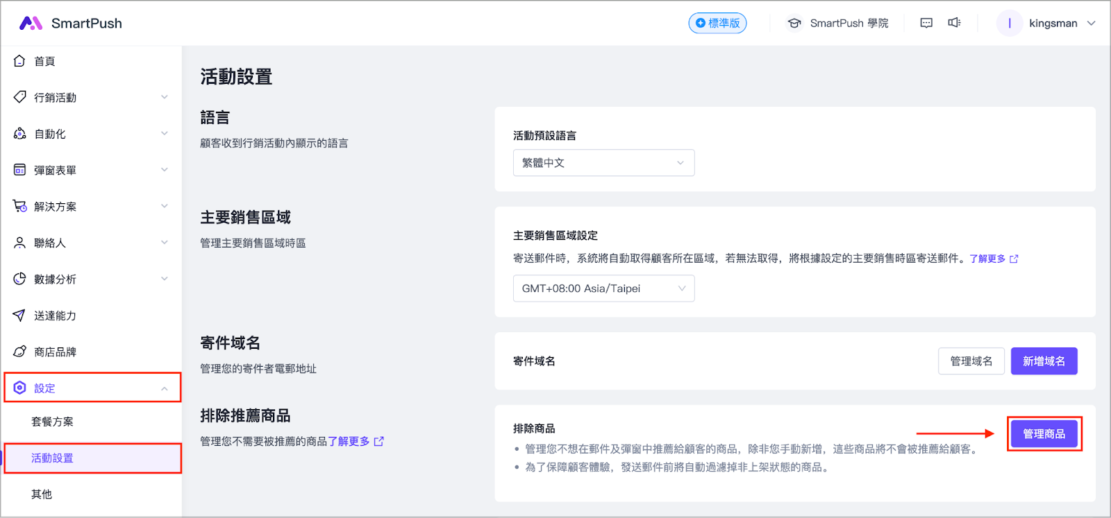 前往「設定 > 活動設置」找到「排除推薦商品」,點選「管理商品」即可設定欲排除的推薦商品。
