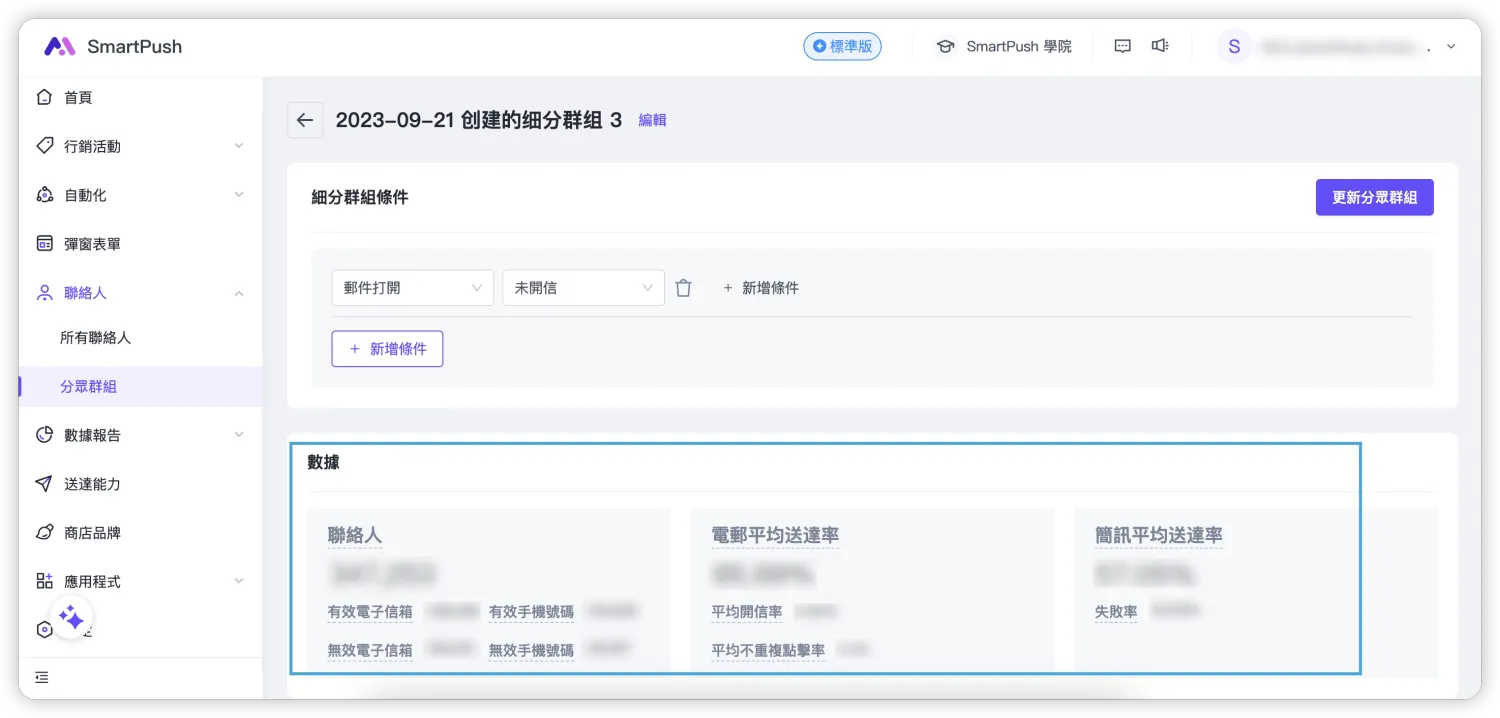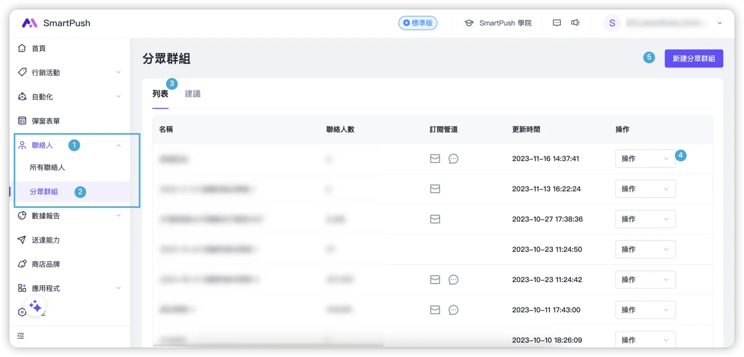 前往 SmartPush 後,進入「聯絡人 > 分眾群組」頁面,在此頁面可以查看所有已建立分眾群組和建議分眾群組: