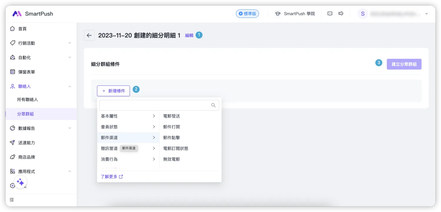 分眾群組是指根據聯絡人的相關屬性,例如性別、國家等進行顧客分類。透過篩選條件可以建立更精細的用戶群組,並運用在行銷活動或者自動化行銷中,精準觸及用戶。